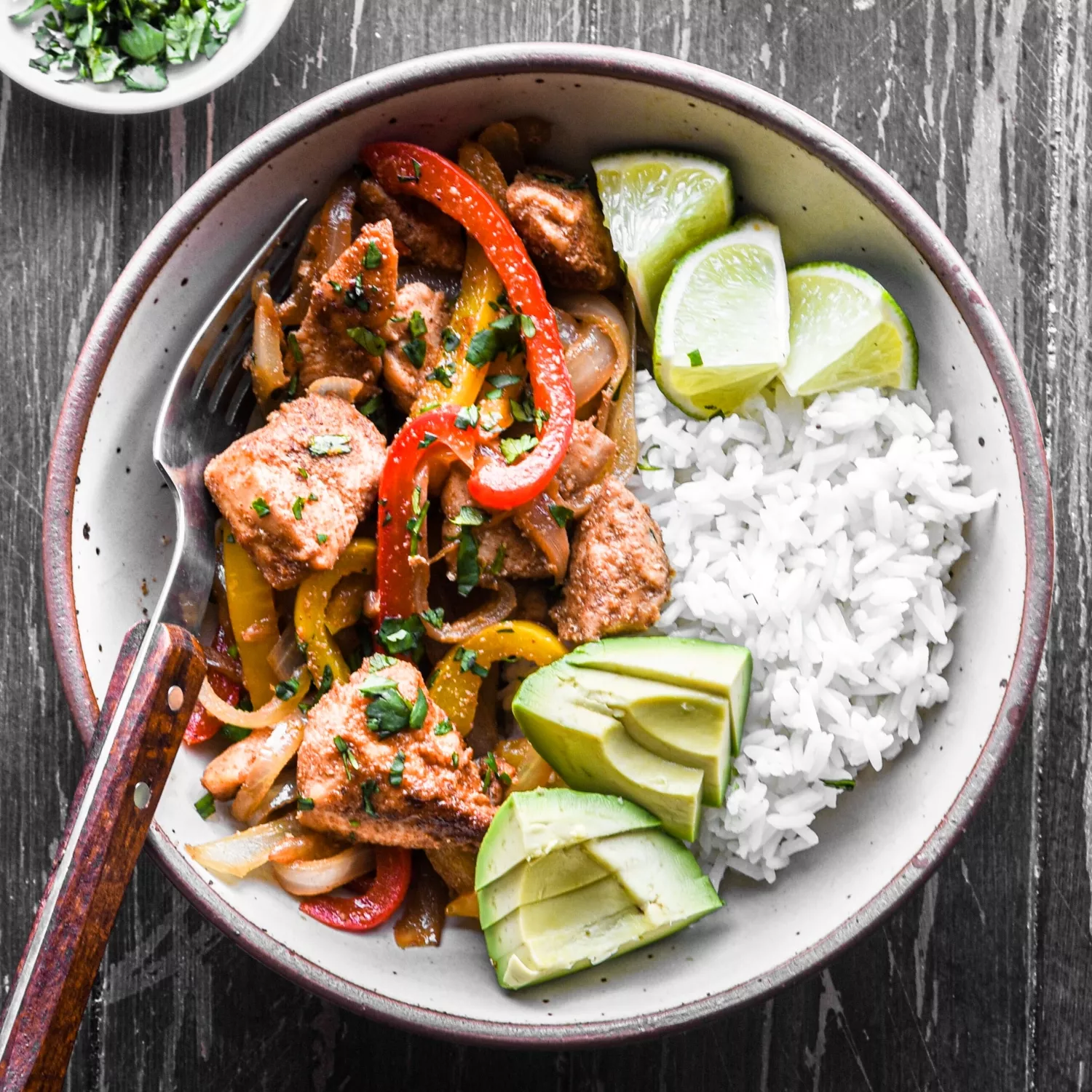 To serve, add rice to a bowl, follow with the chicken, peppers, and onions, top with fresh cilantro, squeeze of lime juice, and avocado.