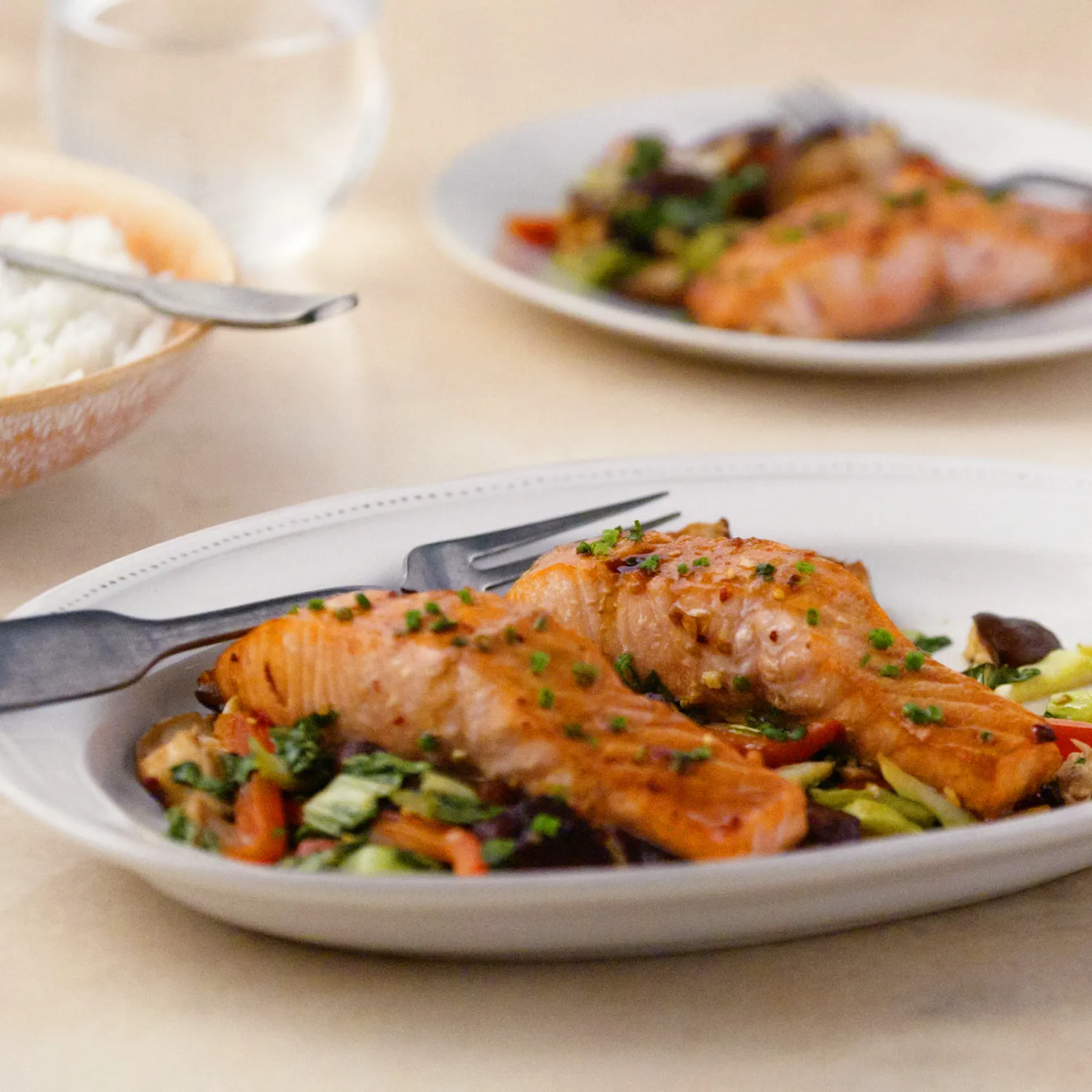 Conventional Oven Method: Preheat oven to 425°F and line a rimmed baking sheet with parchment paper. Arrange salmon and vegetables in a single layer on the prepared sheet tray. Transfer to preheated oven and roast until salmon is cooked and vegetables are tender and edges are crisped, about 20 minutes. Stir vegetables halfway through roasting and baste with pan juices.