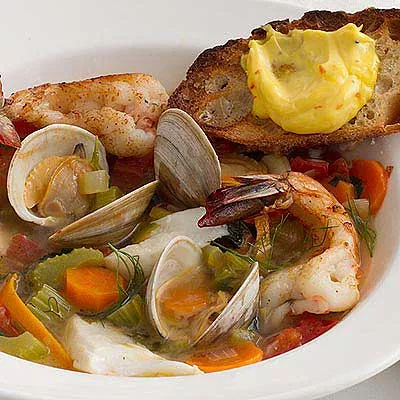 The key to this clam, black grouper and crab-filled bouillabaisse’s great flavor is making your own saffron-infused seafood broth.