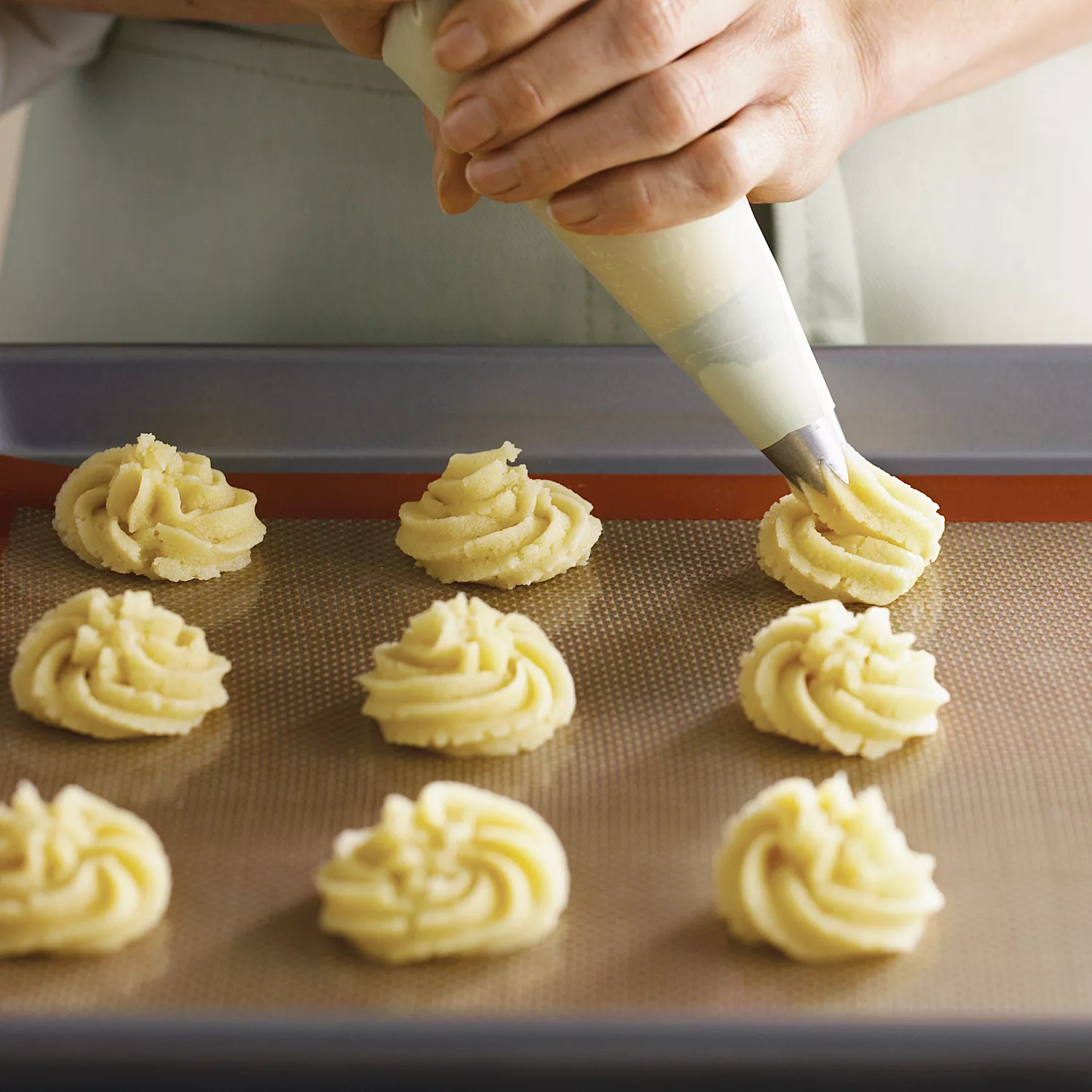 Shape the dough: Line the baking sheets with parchment paper. Immediately spoon half of the dough into the pastry bag fitted with the star tip. Pipe rosettes on a prepared baking sheet, spacing the cookies about 1 inch apart. (Alternatively, use the cookie press according to the manufacturer’s instructions.) The rosettes should be about ½ inch thick and about 1¾ inches in diameter. Repeat with the remaining dough. Chill the sheets in the refrigerator for 30 minutes.