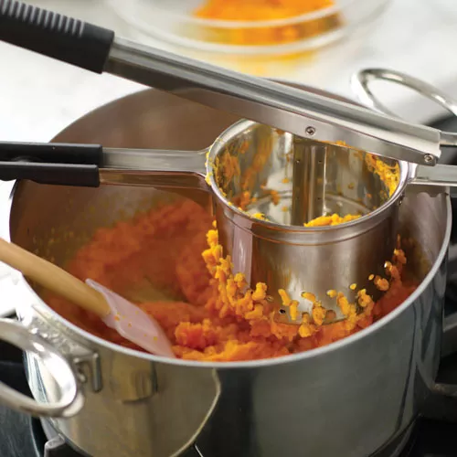 A comforting side dish staple made fall-festive with tangy apple and ginger. The potatoes for this simple mashed sweet potato dish can be boiled or baked. Cook them whole in their skins, then peel them and pass the soft flesh through a potato ricer, food mill, or even an old-fashioned potato masher. Any color sweet potato or any mix of colors can be used, such as orange-fleshed Red Garnets or Jewels and cream-colored