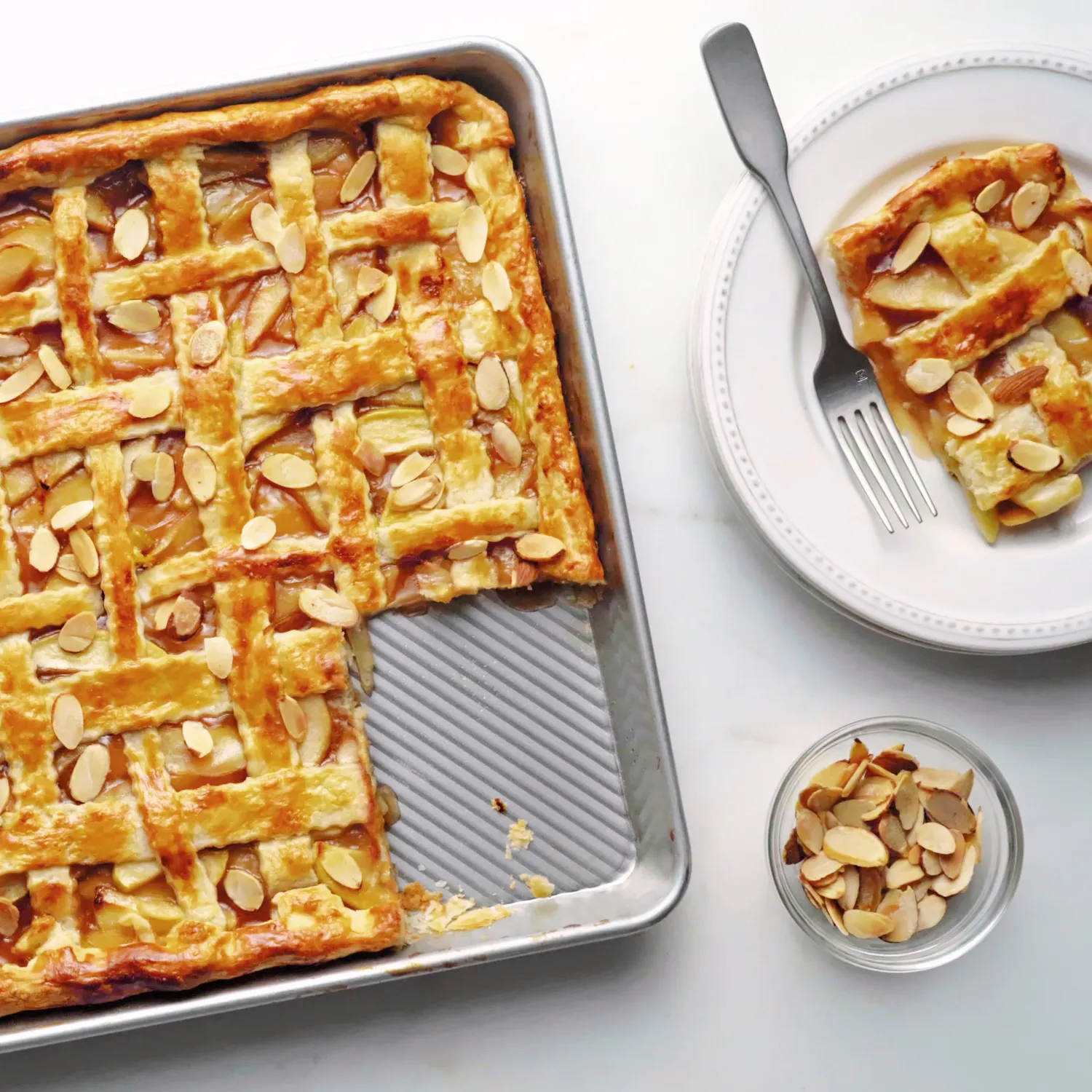 Sheet pan pies are great for entertaining; they bake up fast, look amazing, and can be served easily cut into flaky squares. Here we have added a hint of almond to classic apple pie for something truly unique!