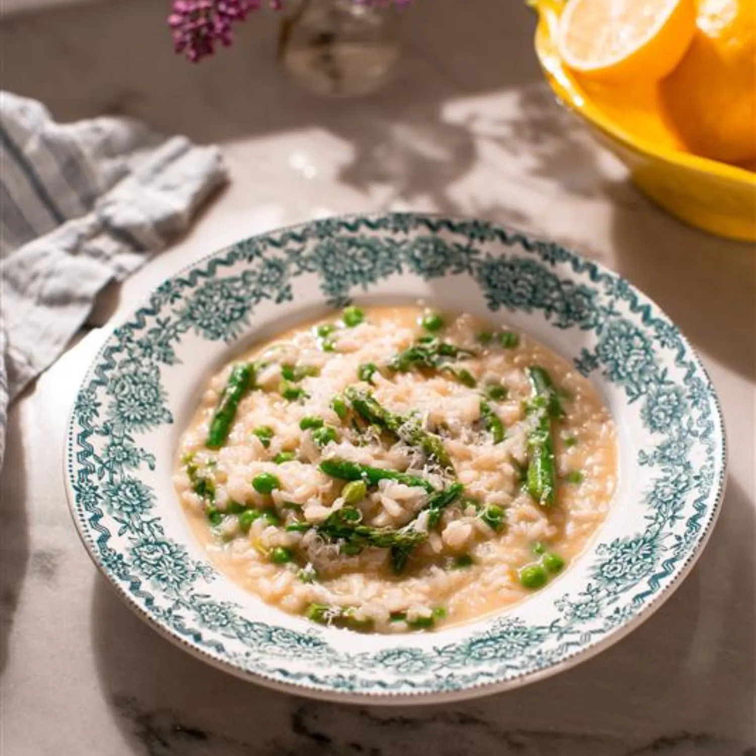 When the rice is ready, remove from heat and add the remaining 2 tbs butter, parmesan cheese, lemon zest, juice, asparagus, and peas, then mix together to combine. If the risotto seems a little thick, ladle in some more broth to loosen it up until your desired texture is achieved. Season as needed and serve right away with a garnish of freshly grated parmesan cheese.