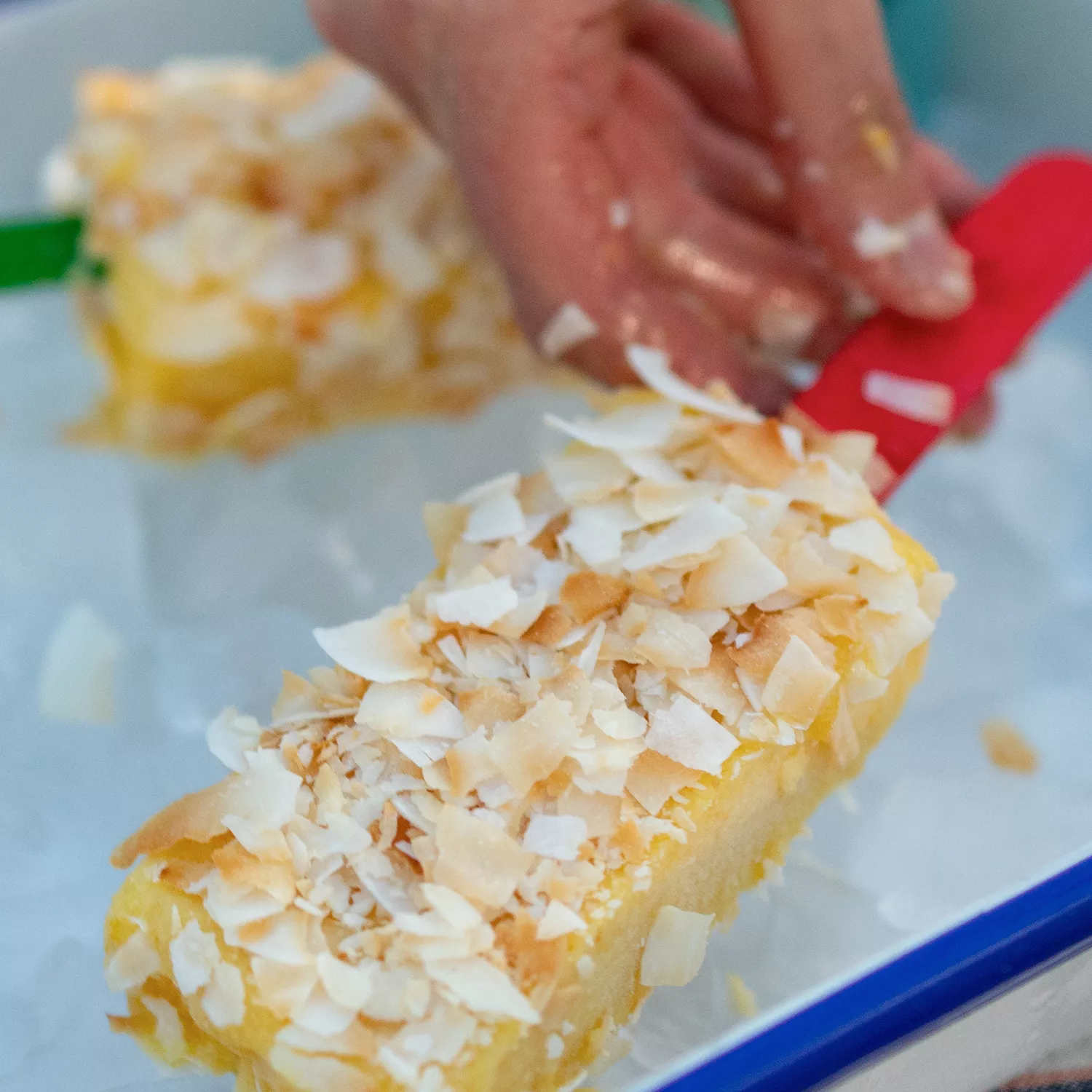 Assemble the pops: Lift pops out of loaf pan and pull away parchment. Using a sharp knife, cut between the sticks into 4-6 bars. Insert ice pop sticks into the short end of the bars. Let pops warm up at room temperature for a few minutes if this is difficult. If using ice pop molds, follow manufacturer’s instructions for unmolding. Roll ice pops in coconut and eat immediately or store in the freezer.