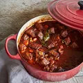 Beef Bourguignon is a casserole that delivers on all levels with an intensely flavored red wine sauce and beef that melts in the mouth. Serve with creamy Dijon potatoes, lightly steamed green vegetables, and some real French bread. Reduce beef stock by half to create a rich double strength stock.