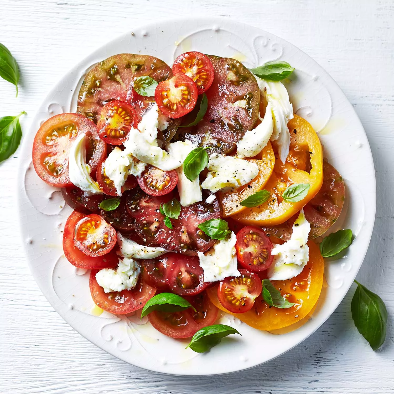 - For a simpler version: Alternate tomato slices, sliced mozzarella and basil leaves on serving platter; garnish with olive oil, salt, and pepper.