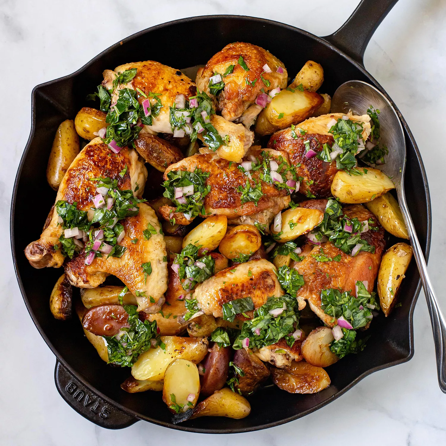 Cast-Iron Skillet Chicken: Heat the olive oil in a large cast-iron skillet set over medium-high heat. Season the chicken with the salt and pepper on both sides and place the chicken pieces skin side down in the skillet. Fill in the pan with the potatoes. (You want the pan really full so that the surface area is completely covered with chicken and potatoes.) Cover with a lid and cook for 8 to 10 minutes, until the chicken has released its juices and everything is golden.