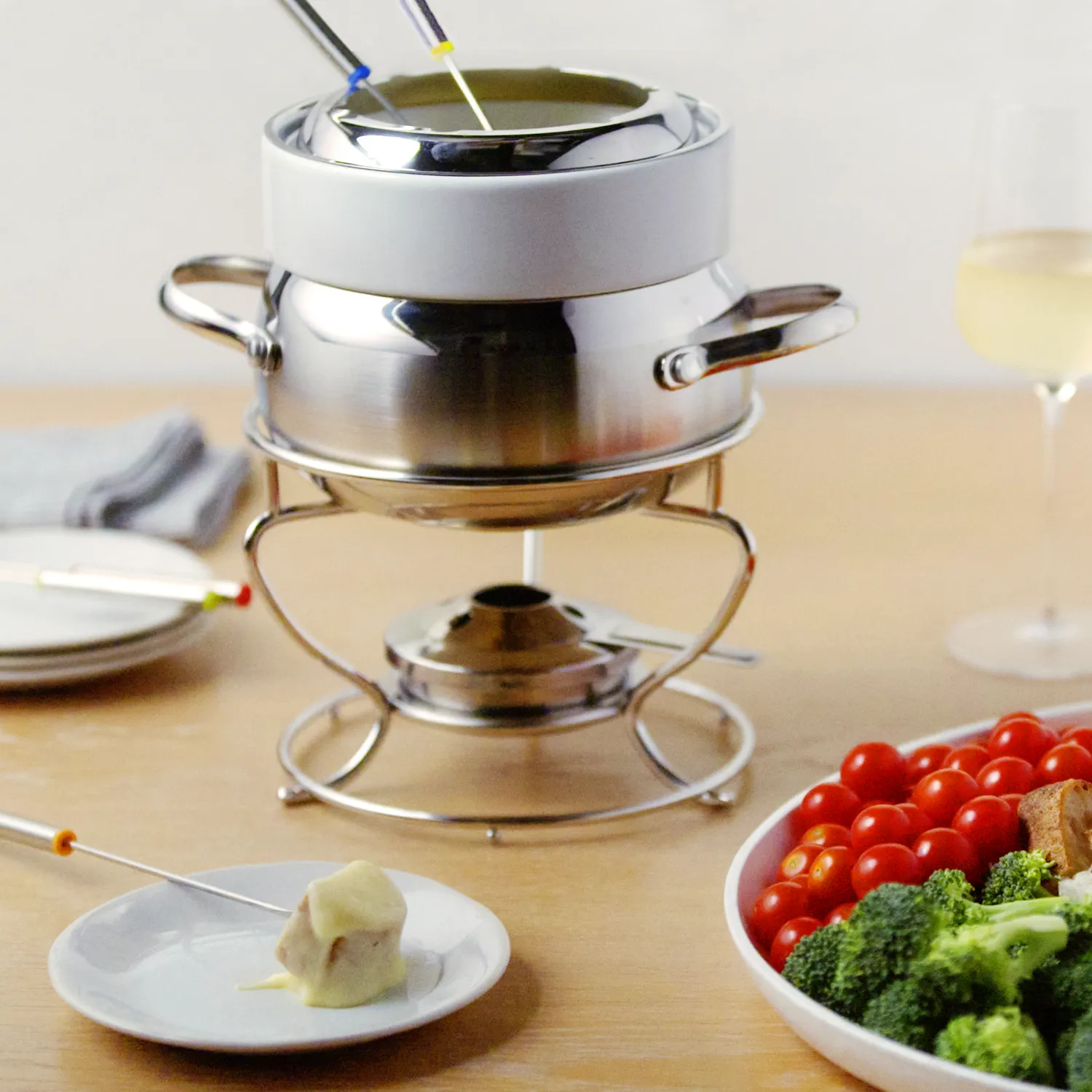 To serve: If not already in a fondue pot, transfer fondue to a fondue pot to keep warm and melted at the table. Arrange bread, apples and blanched vegetables on a platter for dipping. Have fondue forks or bamboo skewers available for dipping, as well as small individual plates and extra silverware for each guest. If fondue begins to thicken too much at the table, add small amounts of wine and stir to loosen it.