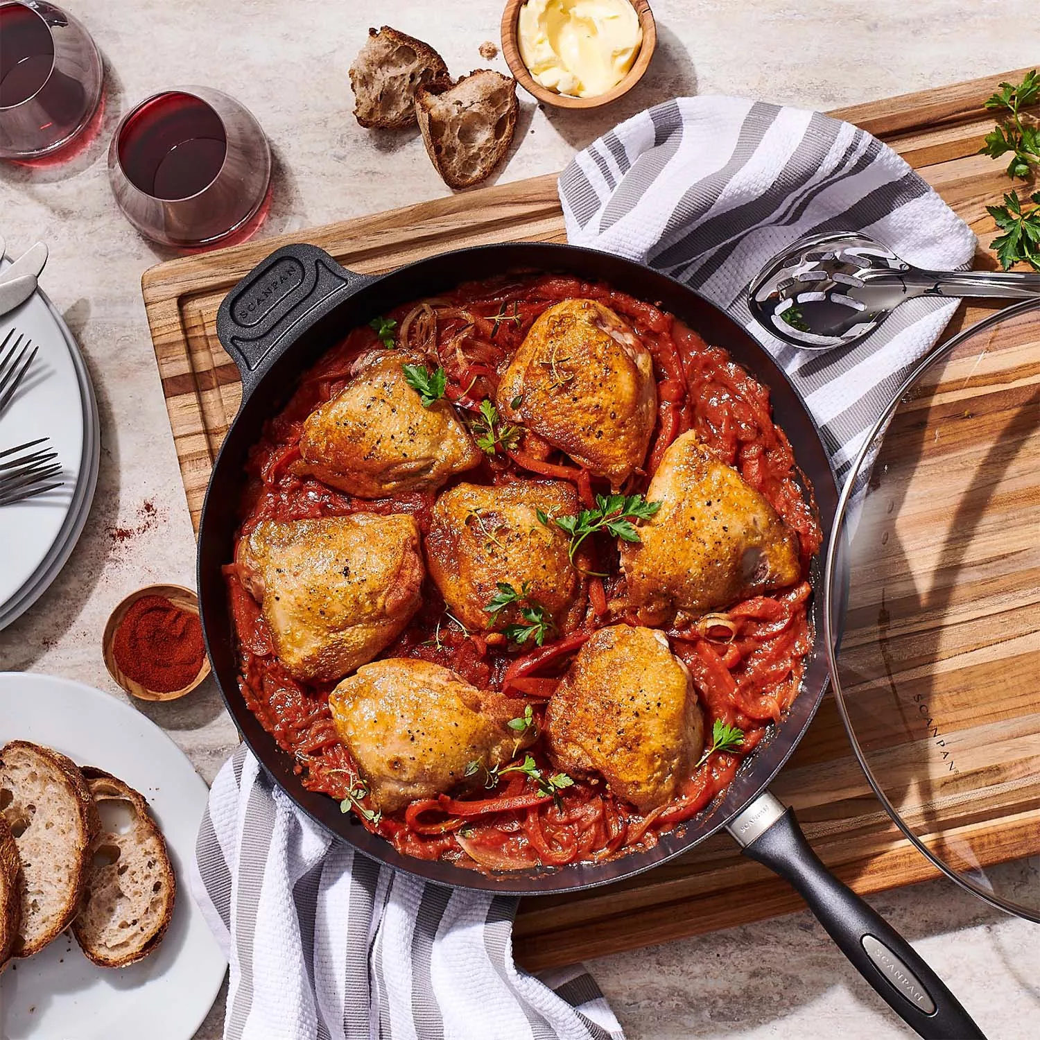 To prepare piperade: Return the skillet to the stove over medium heat. Add the onions, garlic and peppers and cook until tender, about 5 minutes. Add the tomato paste and Espelette and cook until fragrant, 1 minute. Add the wine and deglaze the pan, scraping up the browned bits. Add the crushed tomatoes and sugar and bring to a boil. Add the seared chicken back into the pan, reduce to medium-low heat and cover. Stir and flip the chicken regularly so the ingredients do not burn. Continue to cook until the chicken is tender, about 25 minutes. Taste and adjust seasoning with salt and pepper.