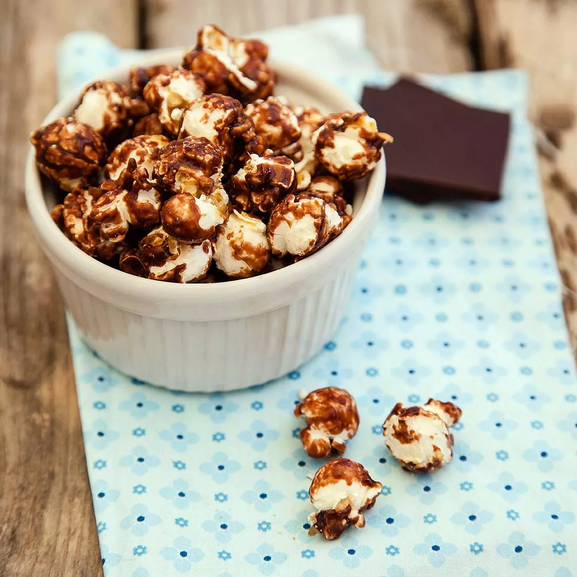 While the popcorn is still hot, add 3 to 4 chocolate squares and turn crank for 20 to 30 seconds, or until chocolate is fully incorporated.