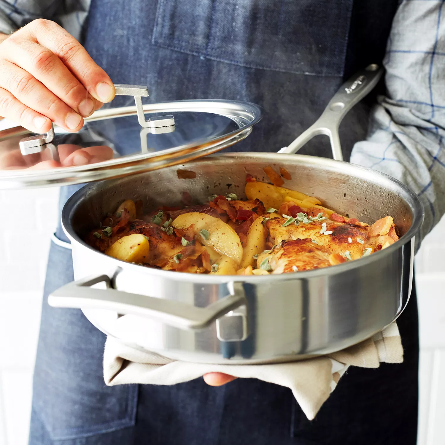 To serve: Divide the braised chicken with apples among 4 warmed dinner plates and serve immediately.