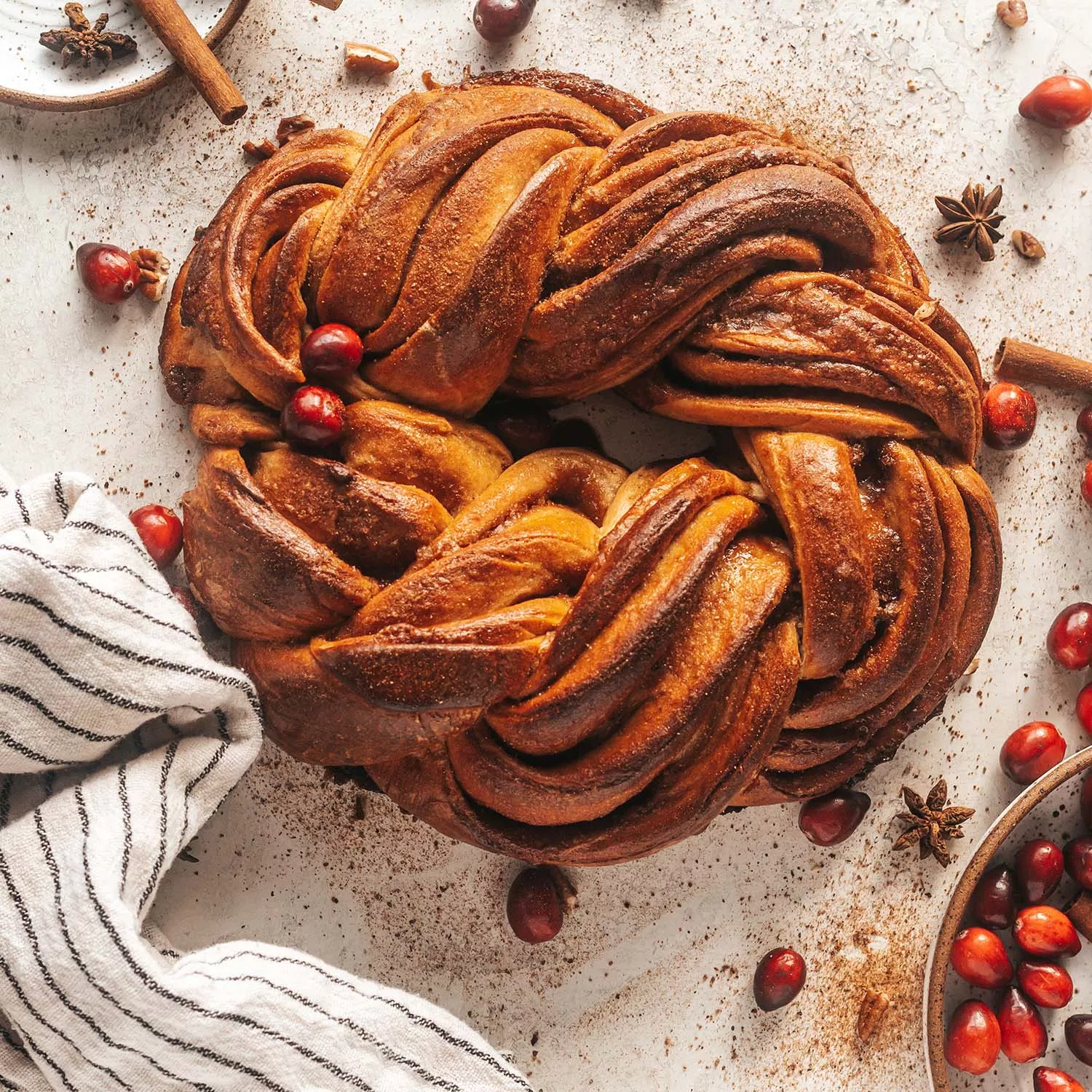 Using a knife or a dough scraper, cut dough in half lengthwise, leaving one end of the log attached. Twist each piece around the other and pinch the ends to seal it. Form the twisted dough into a circle, tucking the ends of the log around each other to seal the wreath.