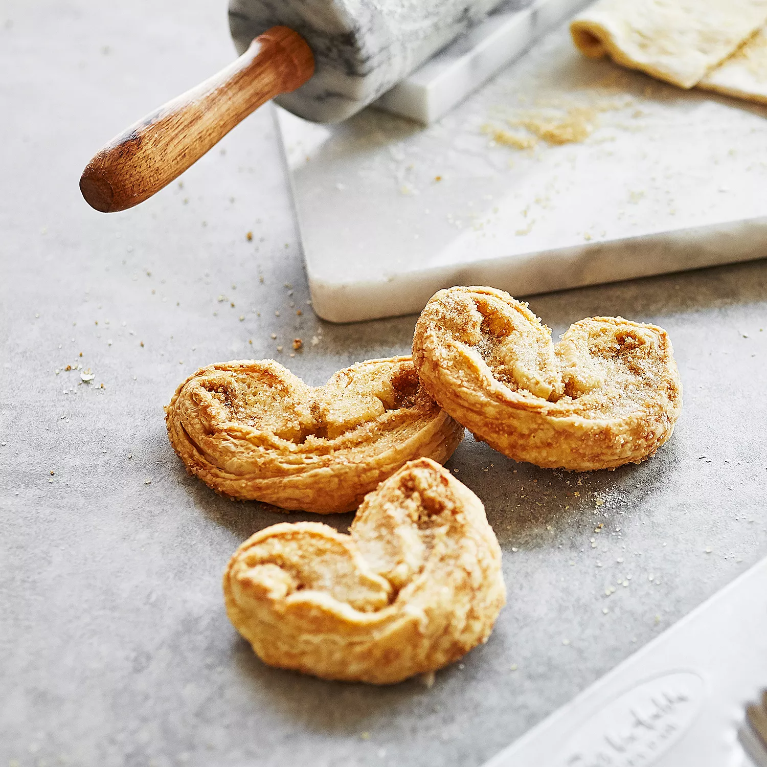 Named (in French) for their resemblance to a palm frond, palmiers are also called elephant ears or butterfly wings. Traditionally, they are made with puff pastry that is rolled out in sugar rather than flour, then folded with additional sugar, thinly sliced, and baked. Because they are sliced and laid cut side down on the baking sheet, they expand sideways instead of upward, resulting in “ears ” that showcase the many layers contained in the dough. Here, we prepare palmiers using laminated dough. Palmiers will keep for 2 weeks in an airtight container at room temperature.