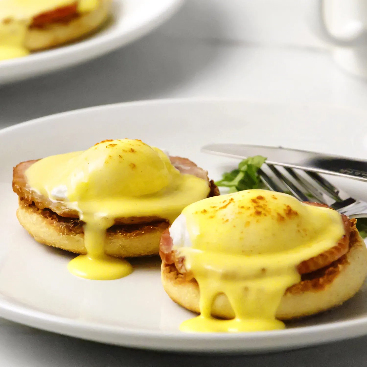 To serve: Place warm, buttered muffin halves on a plate. Top with a slice of Canadian bacon. Place a poached egg on top of the bacon and ladle the sauce over the top. Serve with a dusting of cayenne pepper.<