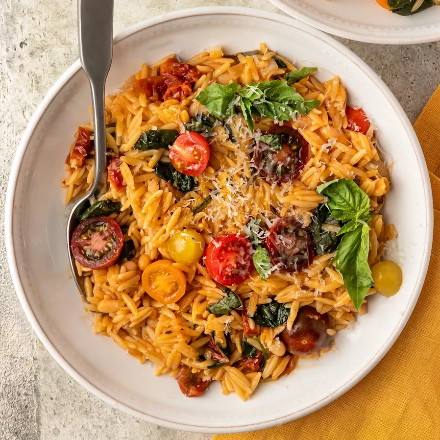 Remove the orzo from the heat and serve immediately with slicing cherry tomatoes, fresh basil, and vegan parmesan. Enjoy!