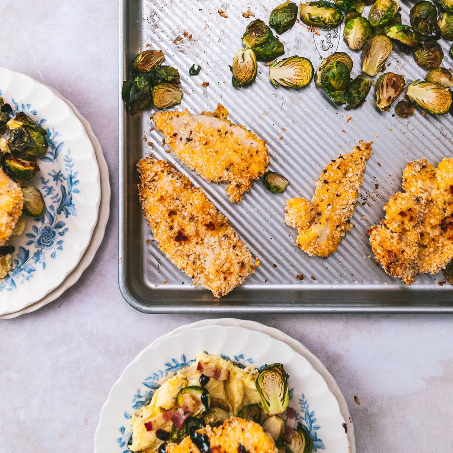 Place the chicken on one end of a baking sheet. Add the brussels sprouts in the center and place the strips of bacon directly on top. Remove the potatoes from the oven and place at the end of the baking sheet.