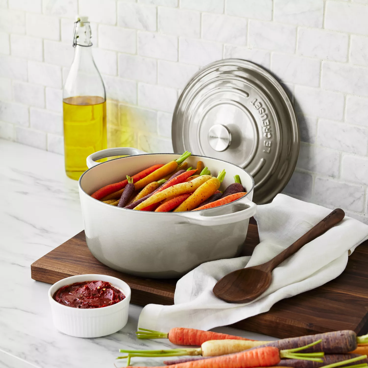 2. To a large bowl, add harissa, sugar, cumin, and coriander; stir to mix. Add the carrots, 1 tablespoon oil, and toss to combine.