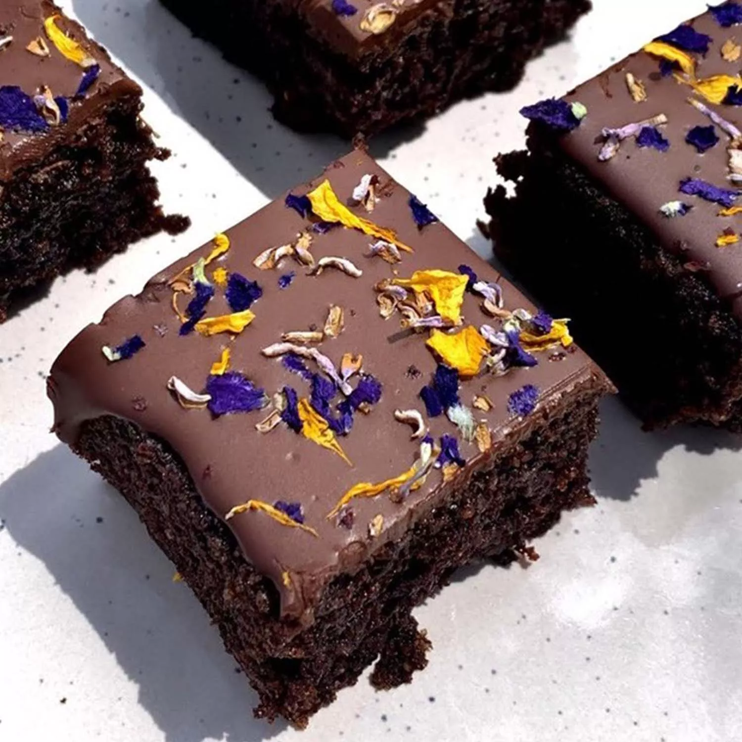Step 9. Pour ganache in an even layer over brownies, immediately sprinkle with crushed wildflowers and sumac over the top before ganache sets.