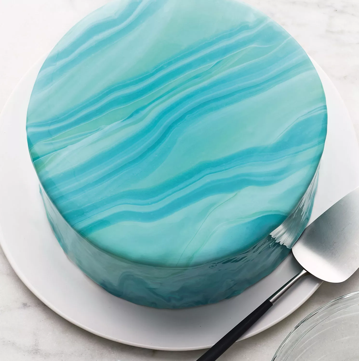 The key to this high-gloss showstopper is combining different shades of white chocolate glaze: Pour it over the cake (we baked the Basic Chocolate, on page 229) at the right temperature so it dries to a mirror-like finish. We chose three shades of blue here, but you could use a different color combination to replicate your favorite stone