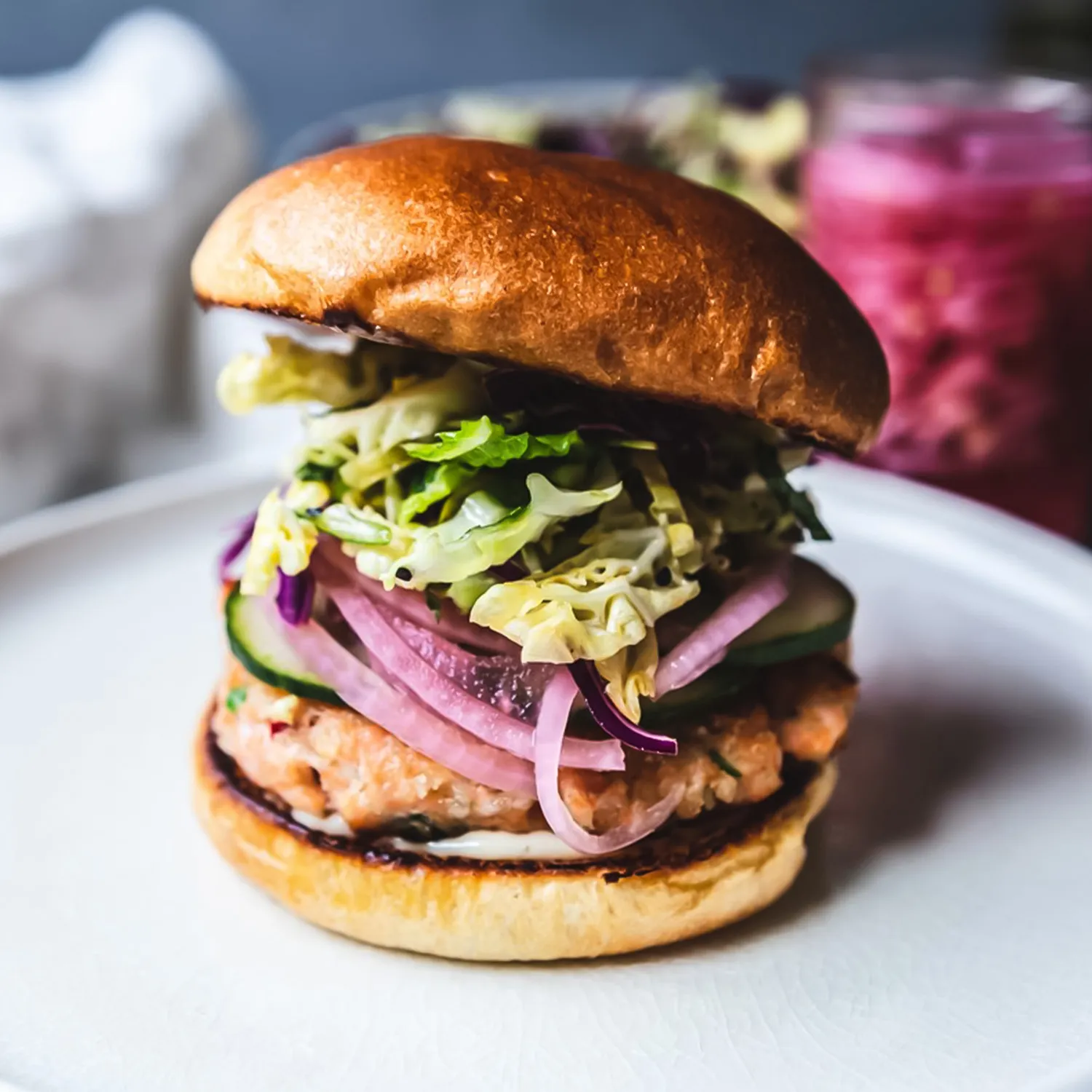To assemble: spread some miso mayo on the buns, top with a salmon burger patty, any pickled condiments you’re using, and some sesame slaw.