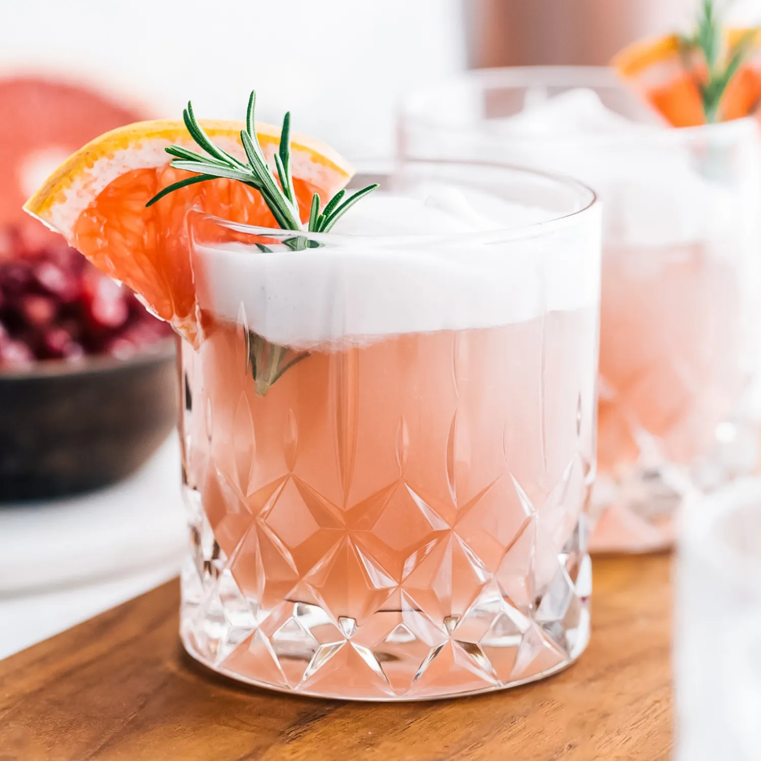 Strain into an old-fashioned glass with ice and add a rosemary sprig, a few pomegranate seeds, and a wedge of grapefruit to garnish before serving!