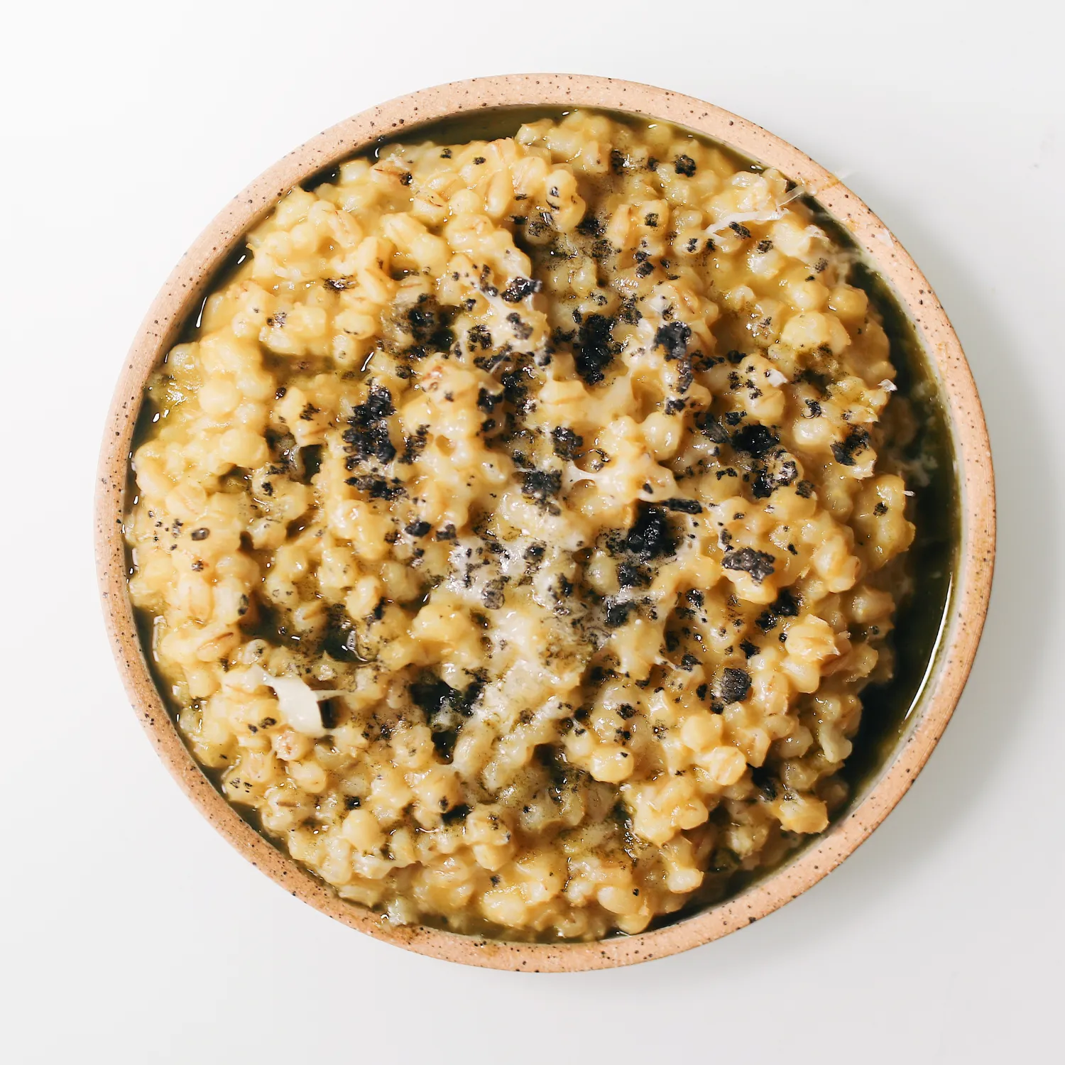 Add the hot broth, one ladle at a time, to the pot of barley and stir constantly until the liquid is fully absorbed. Continue this process for 25 to 30 minutes, or until the barley is fluffy and tender. If you run out of broth before the barley is fully cooked, you can add hot water instead. Turn off the heat and stir in the grated cheese, remaining lemon juice, and butter.