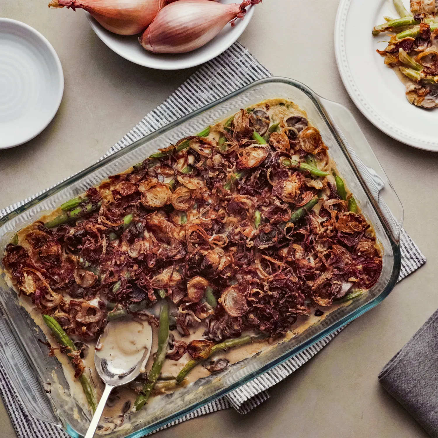 Remove saucepan from heat and fold in green beans, vegetables and lemon juice. Taste and adjust seasoning with additional salt, pepper and lemon juice. Transfer to prepared baking dish and sprinkle crispy shallots over top.