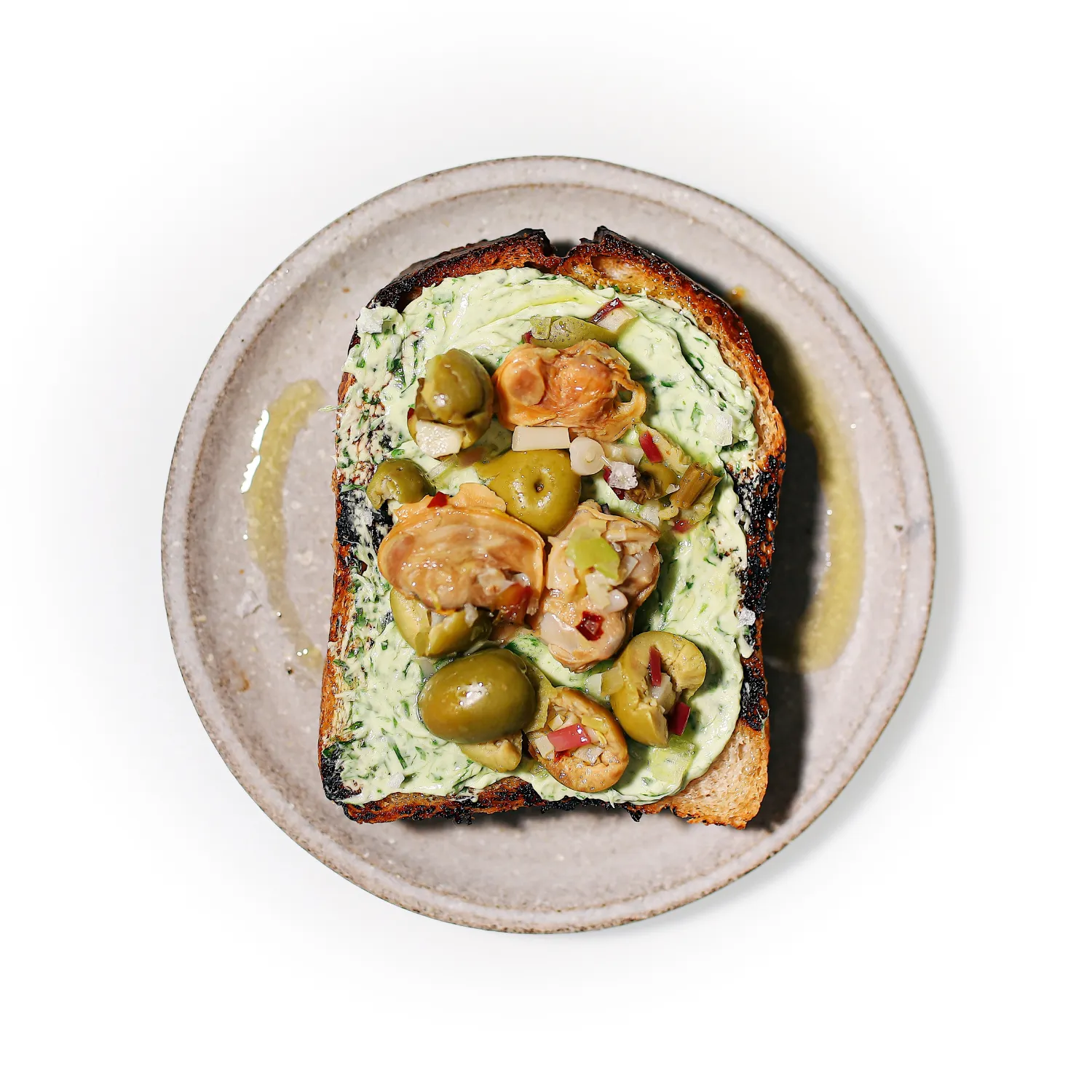 - To the pot of reserved clam liquid, add the chopped garlic, chopped olives, and crushed red pepper flakes; season with salt. Cook for 1 to 2 minutes, or until the garlic is slightly softened and fragrant. Add the clams and cook for 2 to 3 minutes, or until the liquid has been absorbed; taste then season if desired. To assemble, spread a generous layer of ramp butter onto the grilled bread. Top with the clam mixture and a drizzle of olive oil.