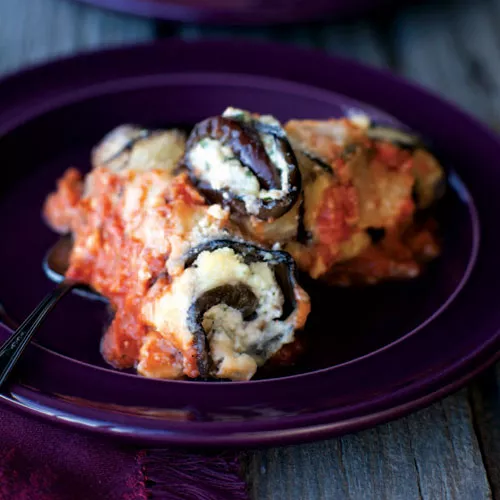 Preheat the oven to 350°F. Choose a shallow baking dish large enough to hold all the eggplant rolls snugly in one layer. Spread 13 cup of the tomato sauce on the bottom of the dish.