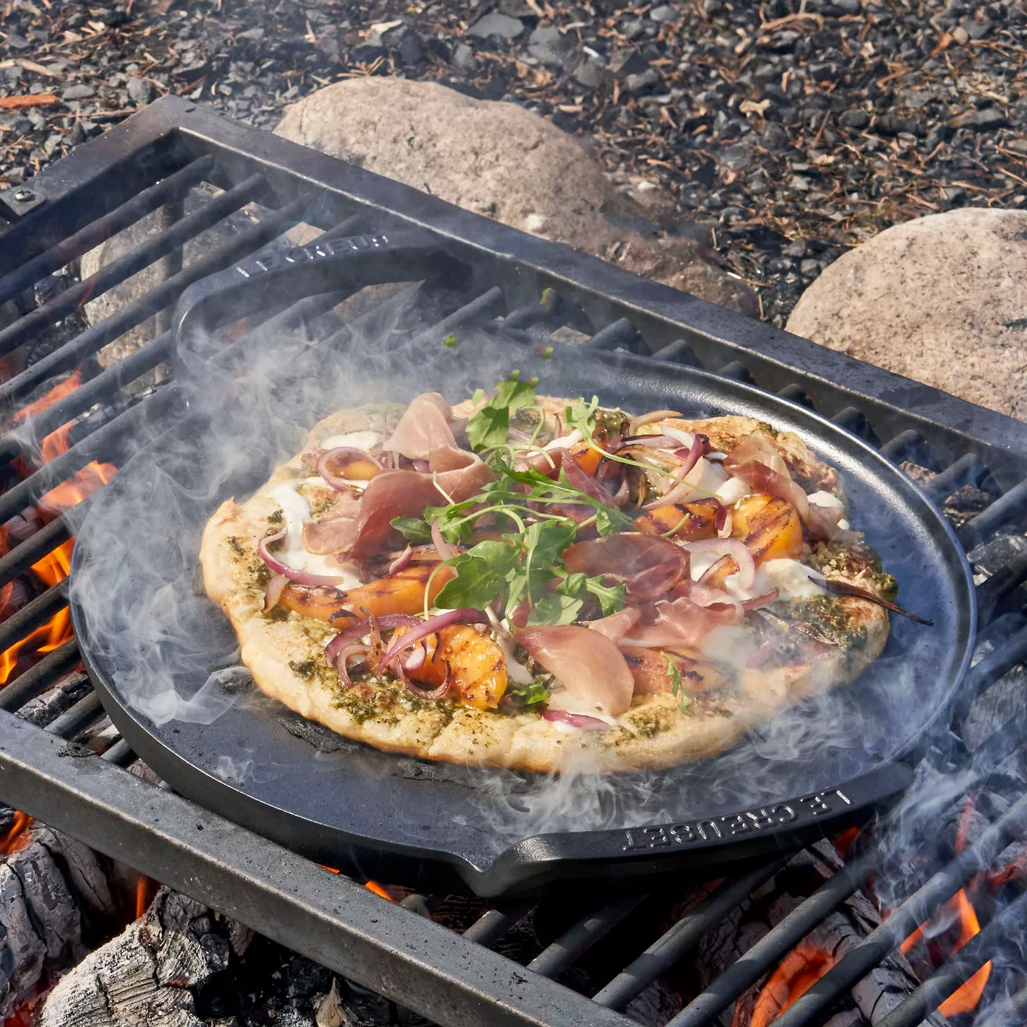 Flip each dough round so grill marks face up. Top each pizza with pesto, prosciutto, mozzarella, grilled peaches and red onions. Return topped dough rounds to grill, cover and grill until second side is cooked, about 3 to 4 minutes. Transfer pizzas to individual serving plates and top with fresh arugula.
