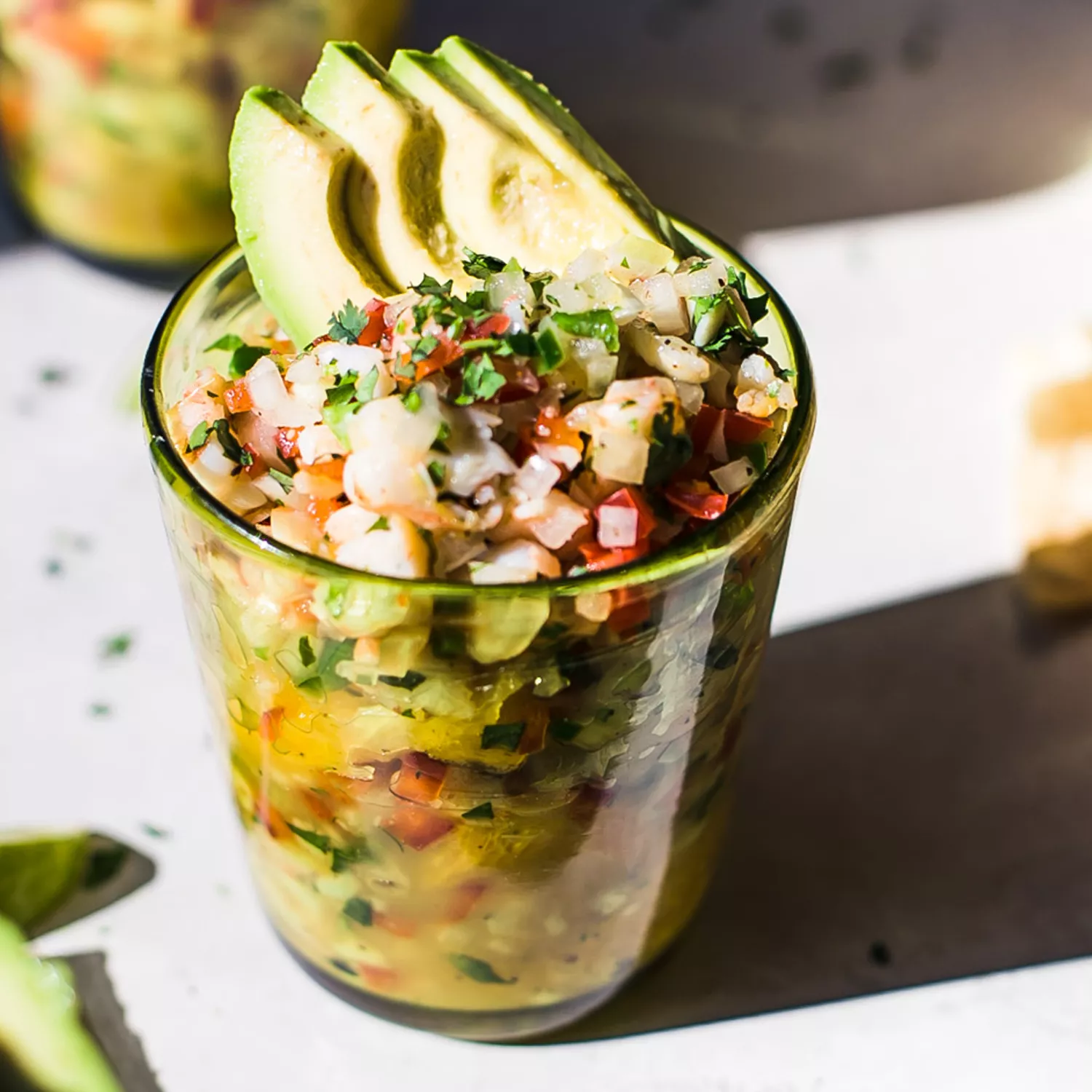To serve: Spoon the ceviche into a small chilled serving bowl or chilled shot glasses, garnish with sliced avocado, cilantro and lime wedges. Serve with tortilla chips or saltines.