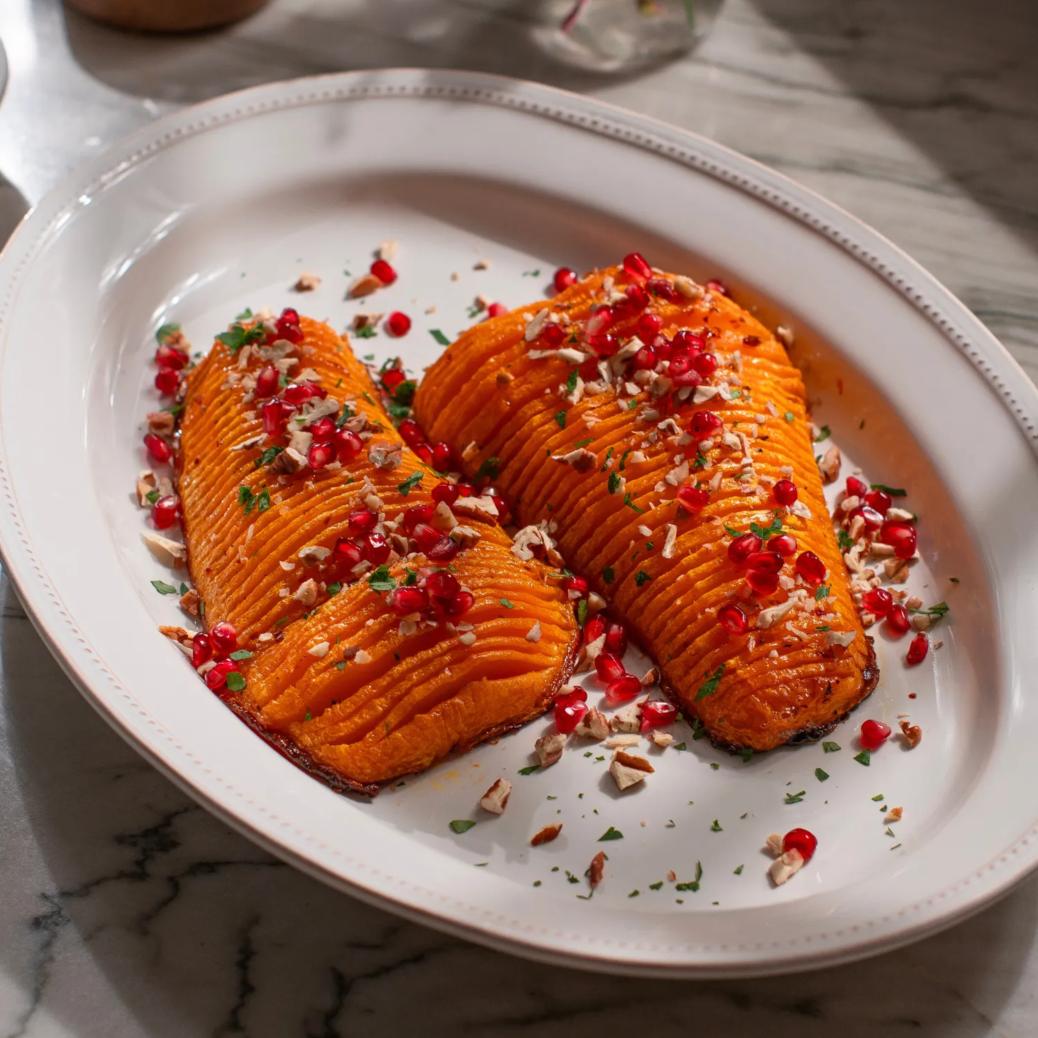 Remove the squash and brush with any remaining glaze. Carefully transfer both halves to a serving platter. Garnish with chopped pecans, pomegranate seeds, and some fresh parsley.
