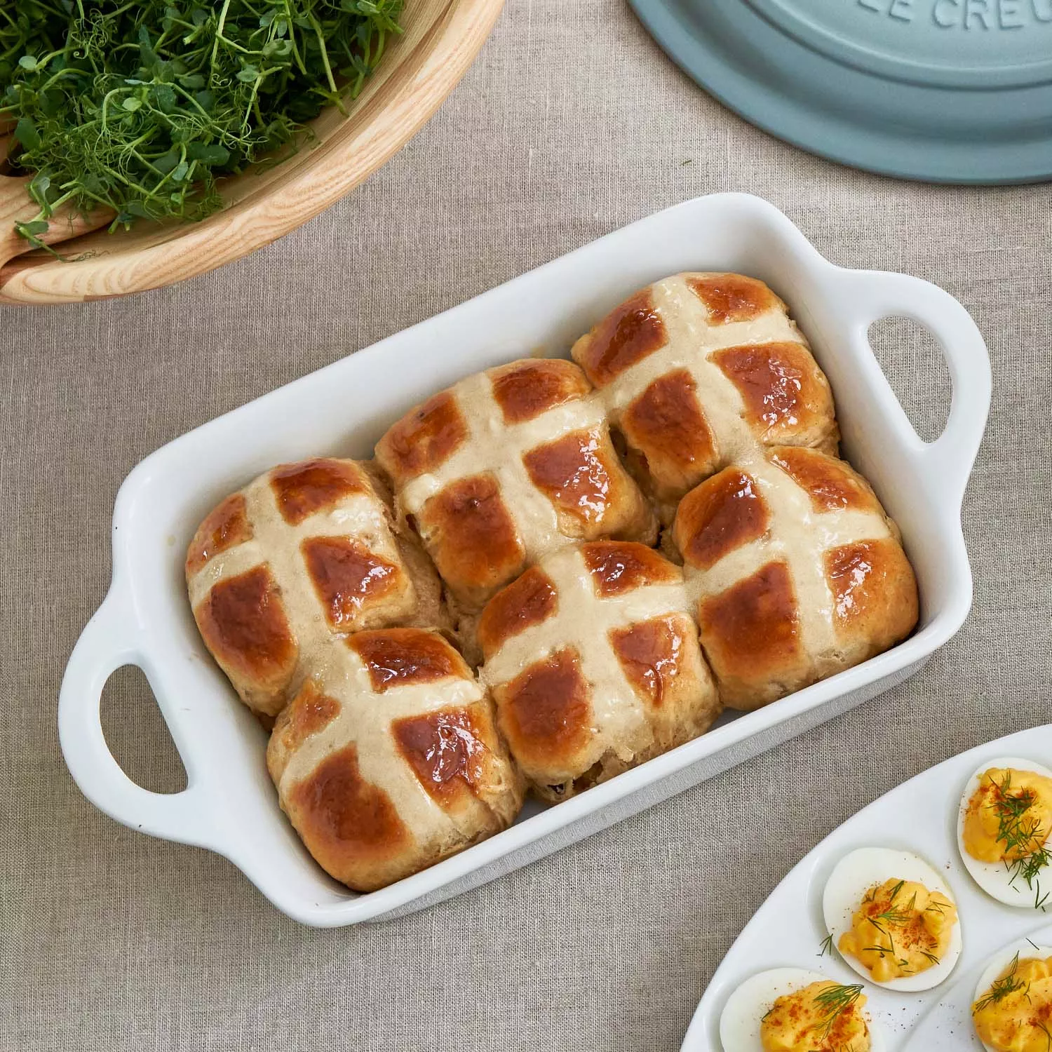 Right before baking, slash the tops of the buns with a lame or sharp paring knife to form a cross on top and transfer buns to the oven to bake until golden brown, 20 to 25 minutes. Remove from the oven and brush the tops with the milk glaze. Transfer to a serving platter and serve buns warm.