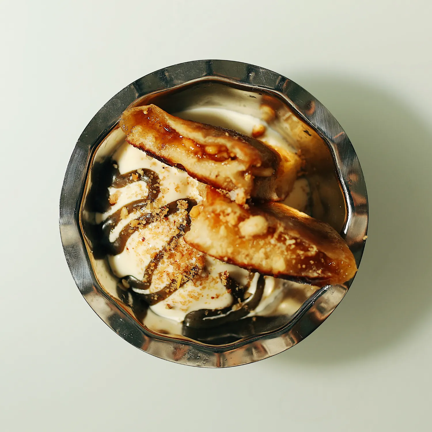This playful spin on a classic korean street food, a pan-fried hotteok donut is filled with brown sugar and pine nuts, and is served a la mode with a scoop of honey corn ice cream.