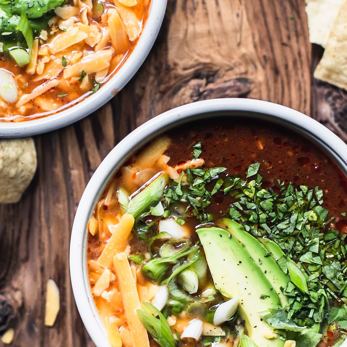Serve with cilantro, cheddar cheese, avocado, green onions and mounds of tortilla chips.