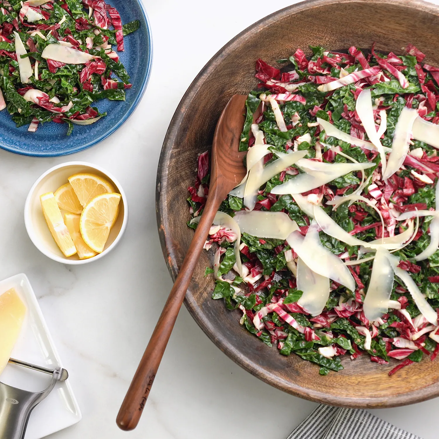Cut the kale or lettuce crosswise into thin ribbons and transfer to a large mixing bowl; add the radicchio. Toss the greens with enough vinaigrette to generously coat.
