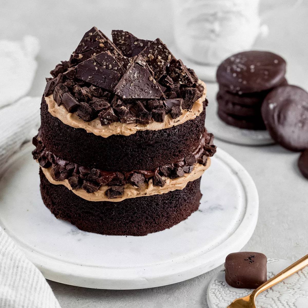 Assemble the cake: Place one cake layer on a cake stand. Cover with half of the caramel filling and then, chop the cookies and spread over top to evenly cover the caramel frosting. Top with chocolate frosting. Add the second cake layer and cover with the remaining caramel frosting and top with more chopped cookies. Decorate with Dark Chocolate Salted Caramel Toffee Bark.