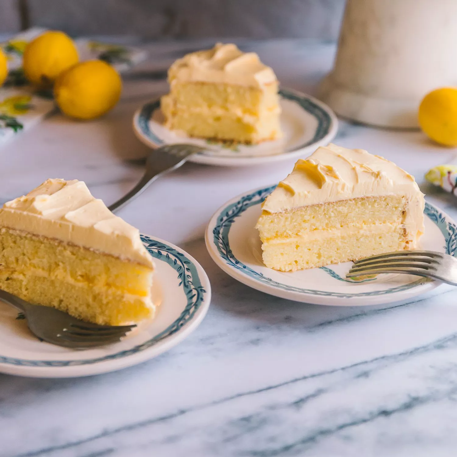 To make cake: heat oven to 350°F. Butter two 8-inch round cake pans; dust with flour, tapping out excess. In electric mixer with paddle attachment or with hand mixer, beat 8 tablespoons butter and the sugar on medium speed until light. On low speed, beat in egg yolks, one at a time. Beat in milk and lemon extract; mixture may look curdled but will smooth out when flour is added. Whisk together flour, baking powder and salt. Add to butter mixture; beat on low speed just until smooth. In electric mixer with whisk attachment or with hand mixer, beat egg whites until stiff but not dry. Stir one-fourth of the egg whites into the batter; fold in remaining egg whites until no streaks remain. Spread batter in prepared pans, dividing it equally. Bake about 25 minutes or until a toothpick inserted into the cakes comes out clean. Cool in pans 5 minutes; turn out onto a rack and cool completely.