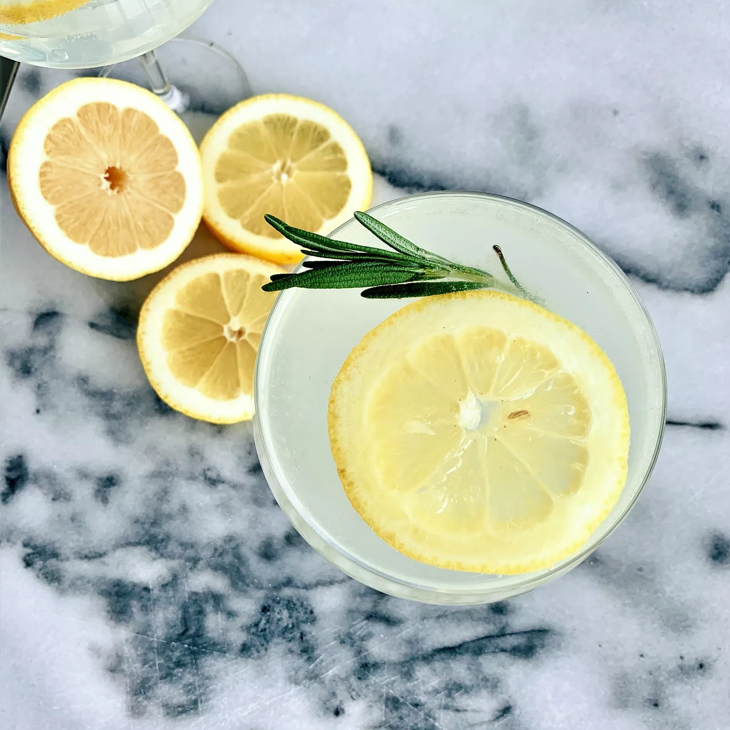 To a cocktail shaker, add gin of choice, fresh lemon juice and ice.