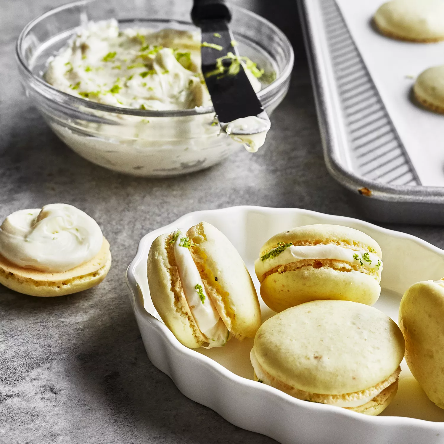 To assemble: Pipe a cherry-size portion of buttercream into the center of the flat side of a cooled macaron. Place another cookie, flat side down, over the filling and gently press just enough to push the filling out towards the edges. Once filled, macarons can be refrigerated in an airtight container up to 3 days.