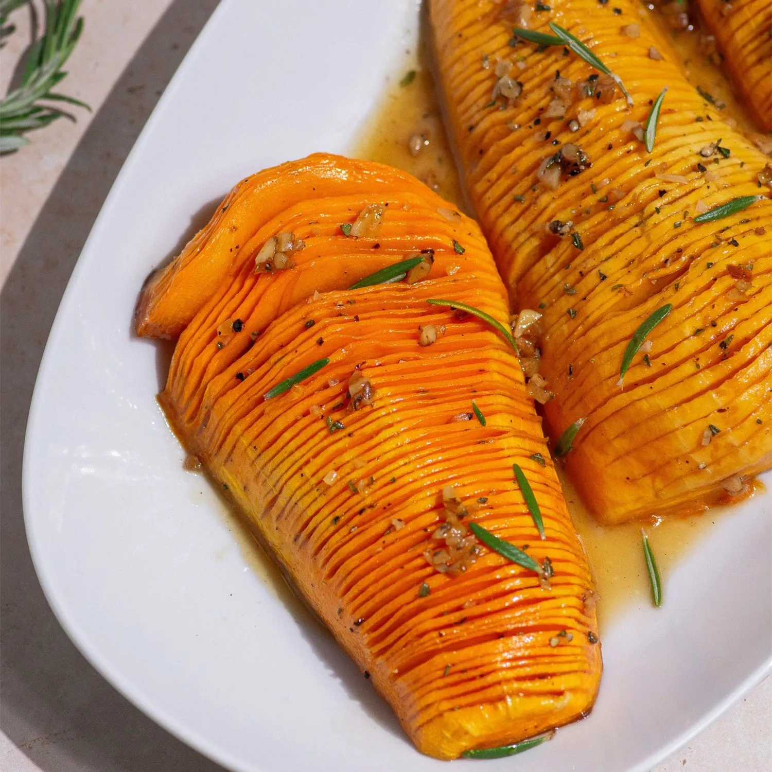 Brush half of the glaze over the hasselback butternut squash, ensuring to get the glaze in between the slices as much as possible.