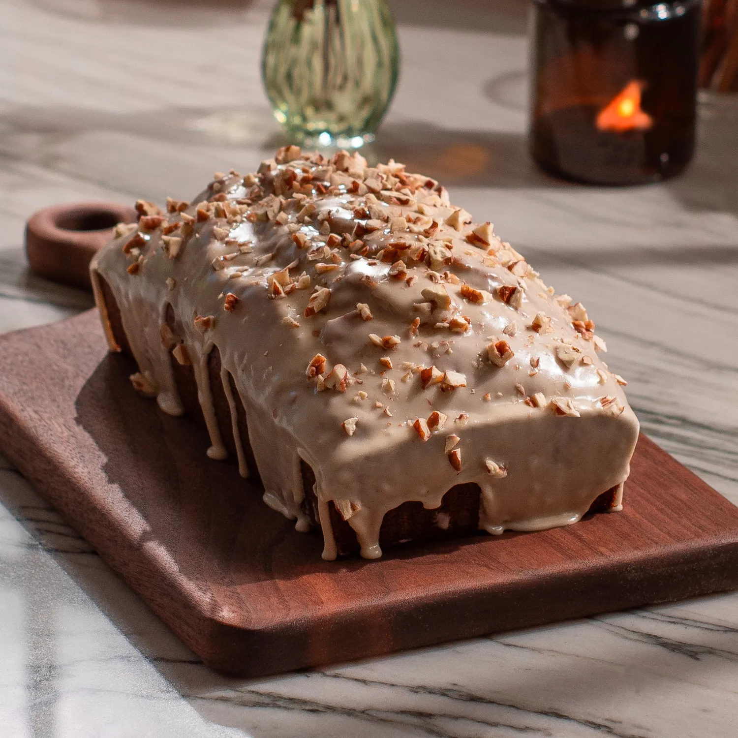 Pour the maple glaze over the cooled loaf and garnish with chopped pecans.