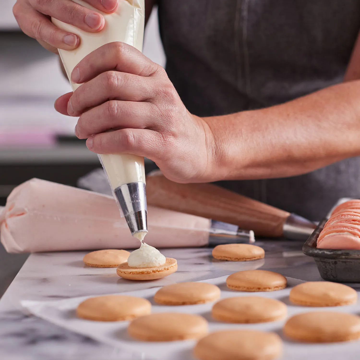 Cooking Class Description: Crisp on the outside, tender within and endlessly elegant—French macarons are the ultimate baking badge of honor. In this hands-on three-hour class, you’ll whip glossy meringue, fold silky batter to just the right texture and pipe picture-perfect shells. Fill your creations with tangy cassis buttercream and rich chocolate ganache studded with toasted pistachios.