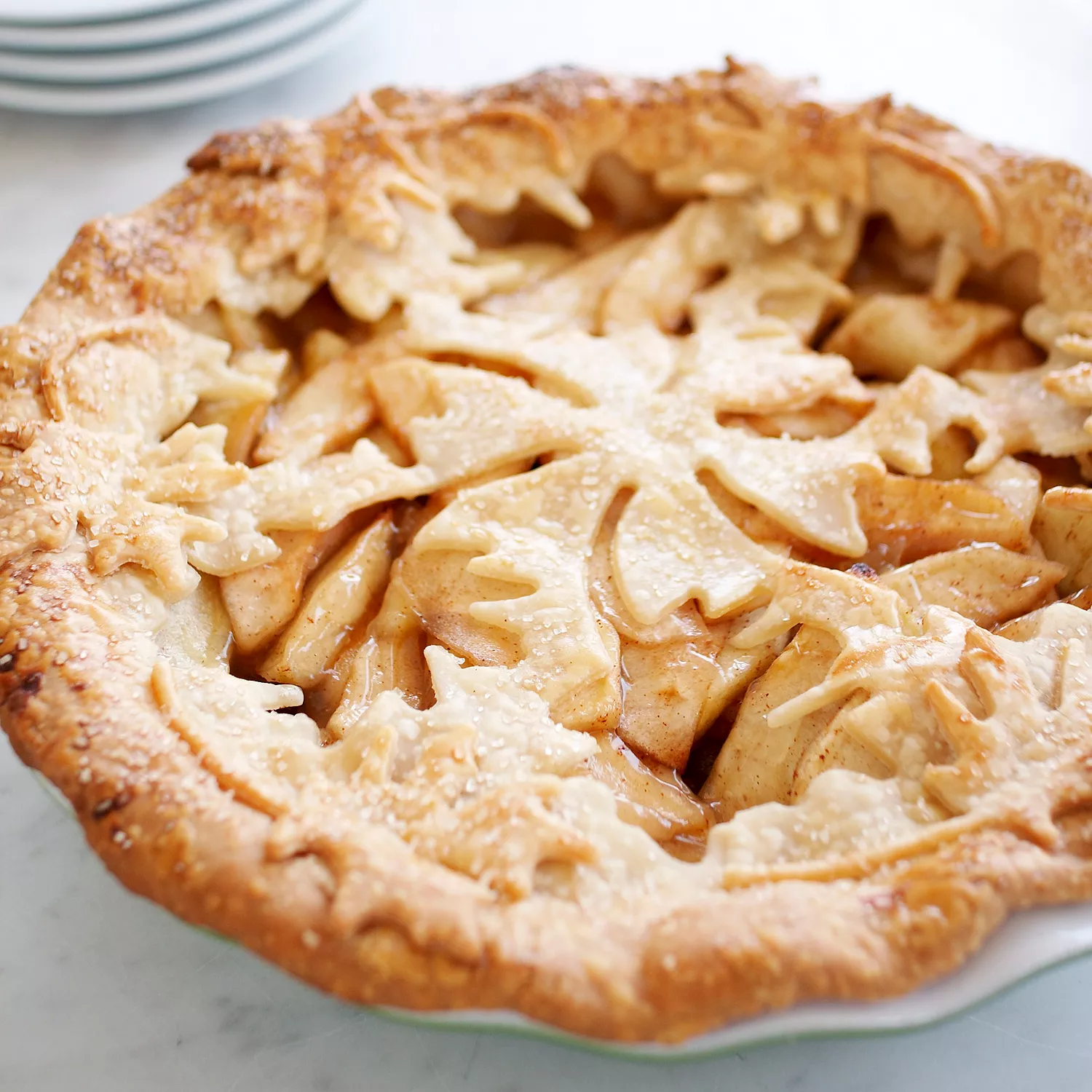 To make the pie: Lightly flour a work surface, and draw a 12- inch circle in the flour. This guide will be the perfect size for a standard 9-inch pie dish. Place 1 dough disk in the center of the circle, and dust a little flour on top. Using the circle as a guide, roll out the dough into a 12-inch round about ⅛ inch thick. Loosely roll the dough around the rolling pin, center the pin over the pie dish, and carefully unroll the round over a 9-inch pie dish, easing it into the bottom and sides and allowing the excess to overhang the sides. Fill with the apples. Trim the overhanging dough to ½ inch. Roll out the remaining pie dough into a second 12-inch round. Transfer the dough round the same way, centering it over the apple filling. Fold the overhang of the upper round under the edge of the bottom crust. Pinch the crusts together and flute the edge attractively. Cut a small hole in the center of the pie to allow steam to escape. Freeze for 15 minutes or refrigerate for 30 minutes.