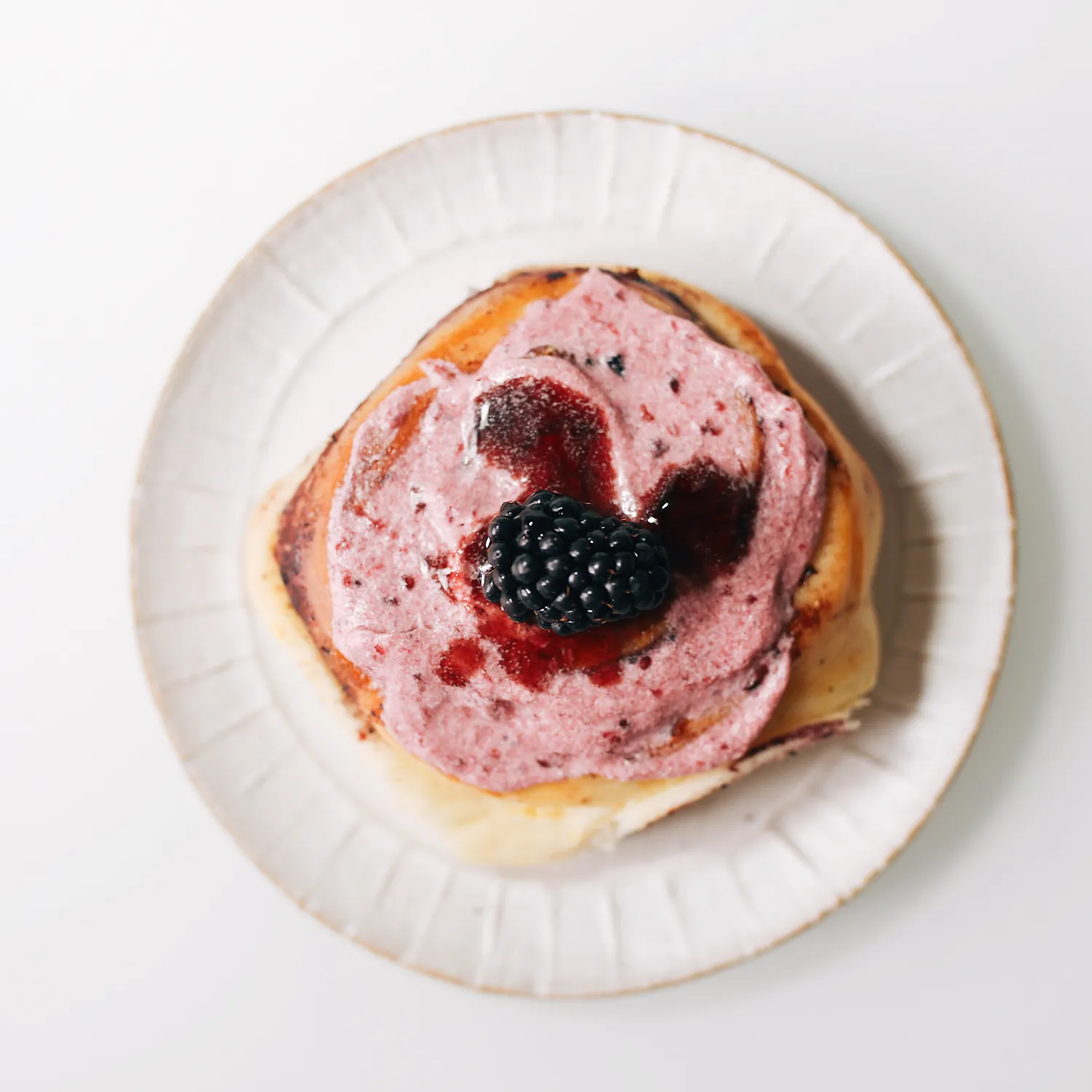 Inspired by the incredible pastries at Brauð & Co. in Reykjavík, these cinnamon rolls blend Icelandic tradition with a summery twist. Typically filled with marzipan “remonce, ” this version swaps in wild berry jam and a vibrant blackberry-skyr frosting for a fresh, seasonal feel.
