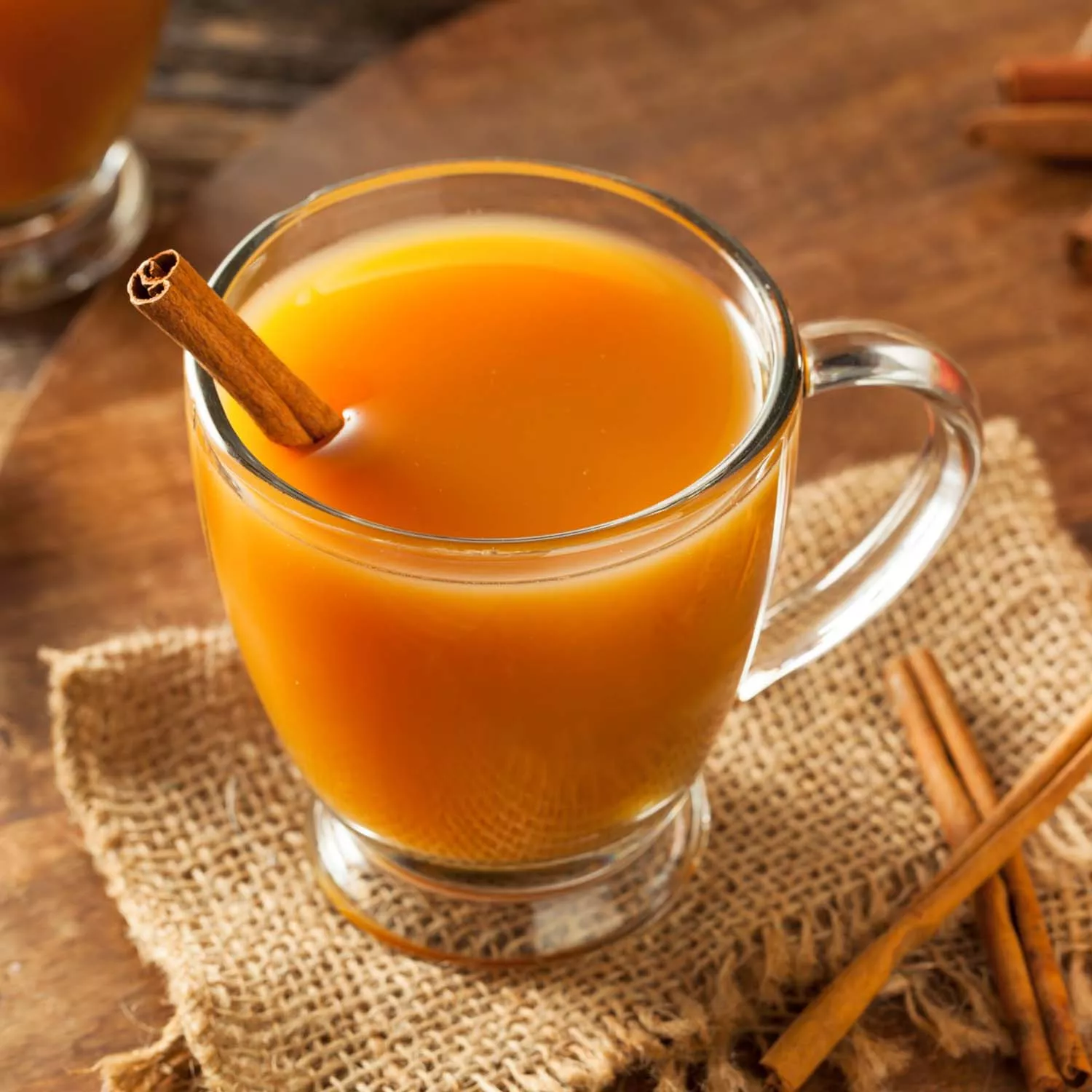Divide the mocktail into two mugs. Garnish each mug with an orange round and a cinnamon stick.