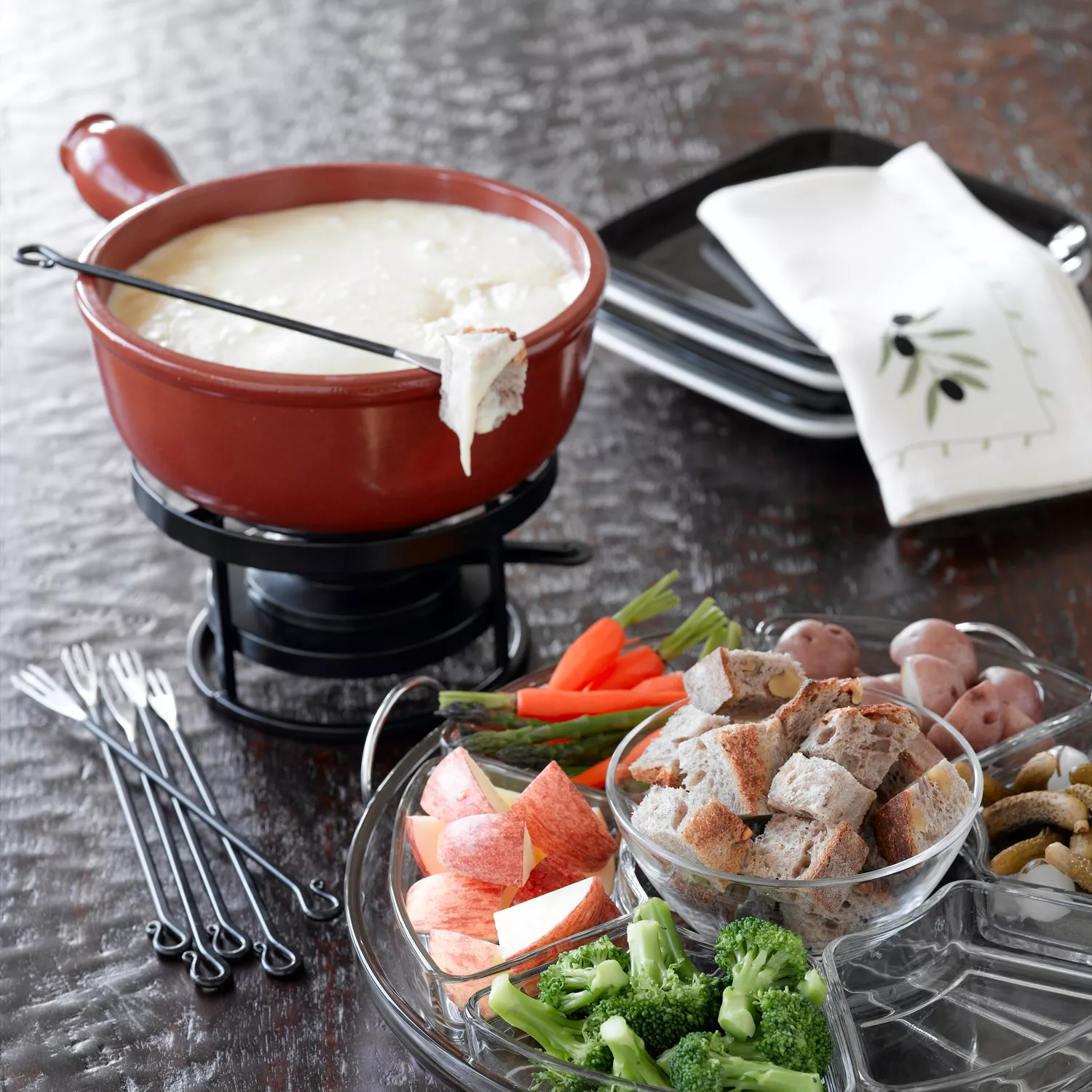 • Bite-sized pieces of baguette, soft pretzels, green apple, veggies and/or sausage, pears, grapes, pickles, and cocktail onions