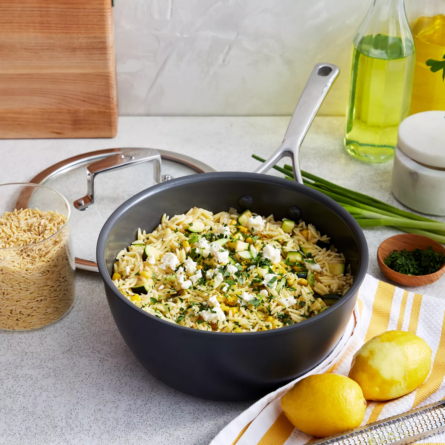 1. To a medium saucepan set over medium-high heat, add oil. When oil is shimmering, add onion and zucchini and cook until onion is translucent; about 4 minutes. Add garlic and orzo and cook until garlic is fragrant, and orzo is lightly toasted, about 1 minute.