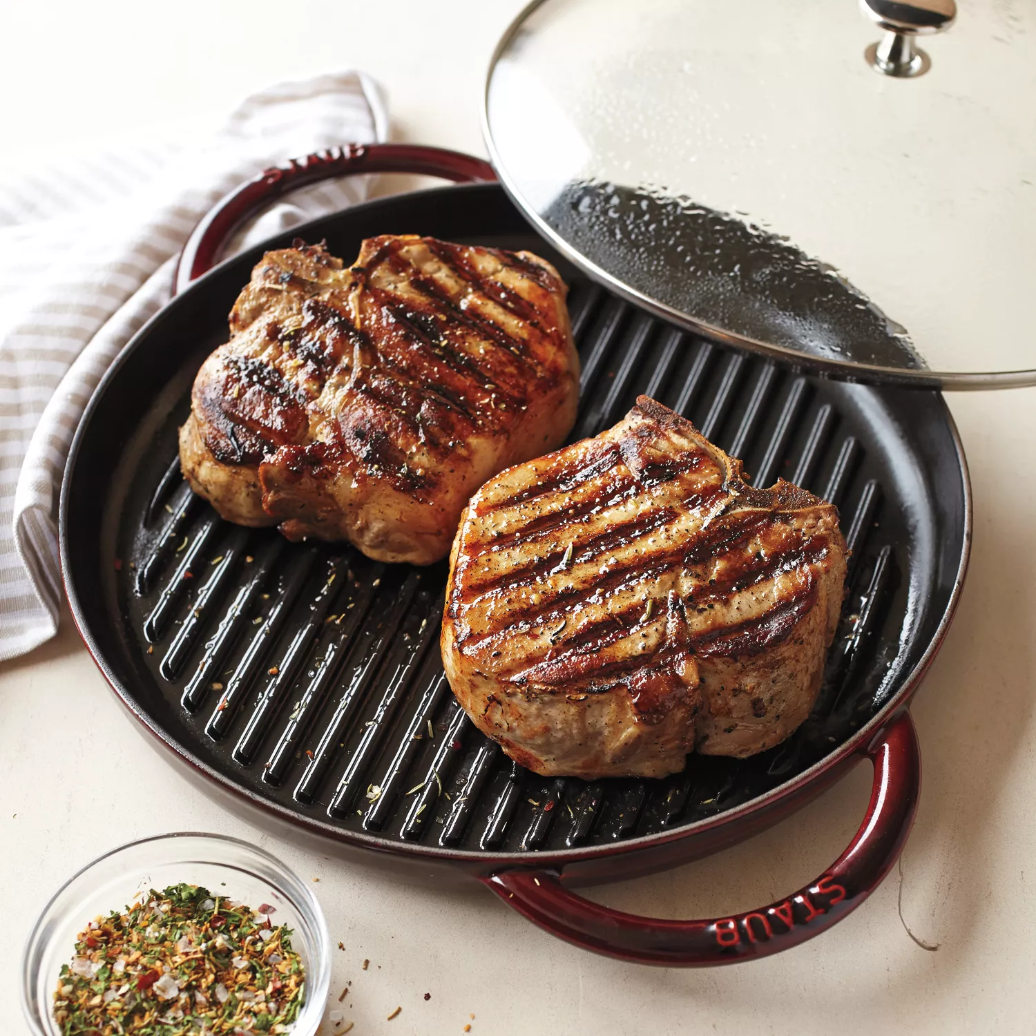 Heat steam grill over high heat. When the pan is hot, brush chops with oil and set 2 chops in the pan. Pour in beer, wine or water along the edge of the pan (not onto the chops). Cover, reduce heat to medium-low, and cook until grill marks form, about 4 minutes. Turn chops over, cover and cook until cooked through and grill marks form on the other side, about 4 more minutes (bone-in chops may take an extra minute or so). Transfer chops to a plate or serving platter, cover and let sit for at least 10 minutes. Repeat with remaining chops.