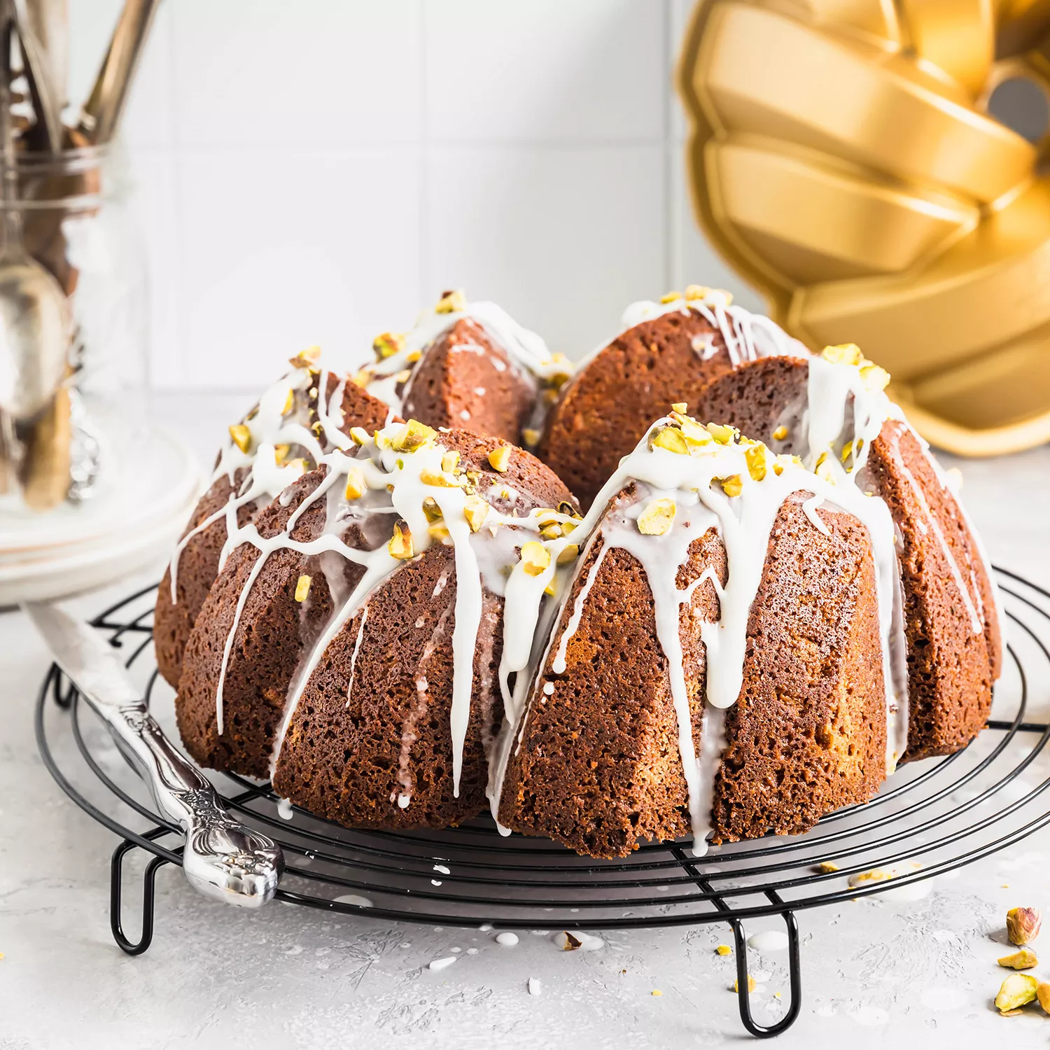 Make the lime glaze by whisking together confectioner’s sugar, lime juice, and corn syrup, Adding the lime juice, 1 teaspoon at a time, to reach desired consistency. Drizzle this icing over the Bundt cake and sprinkle it with chopped pistachios. Enjoy!